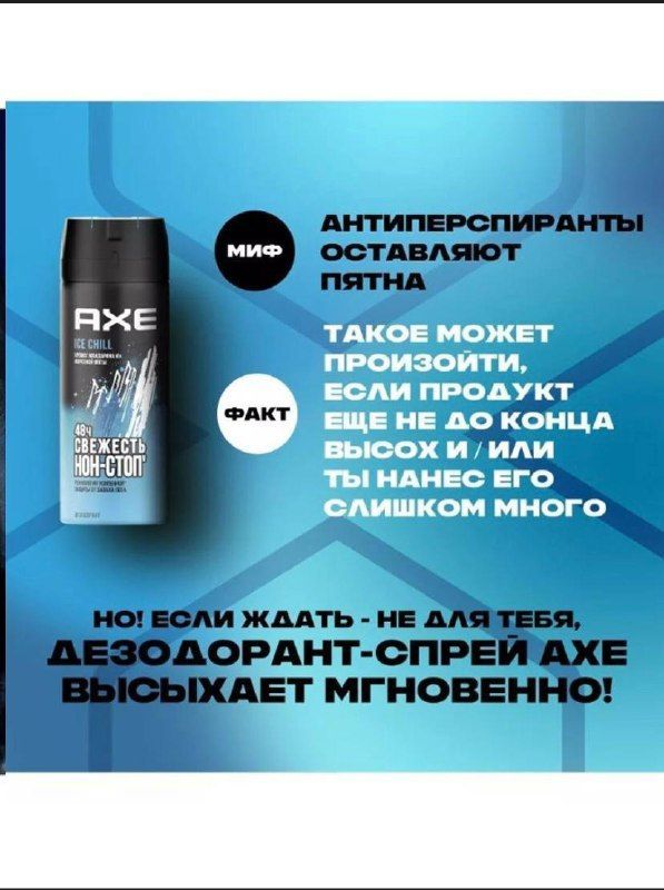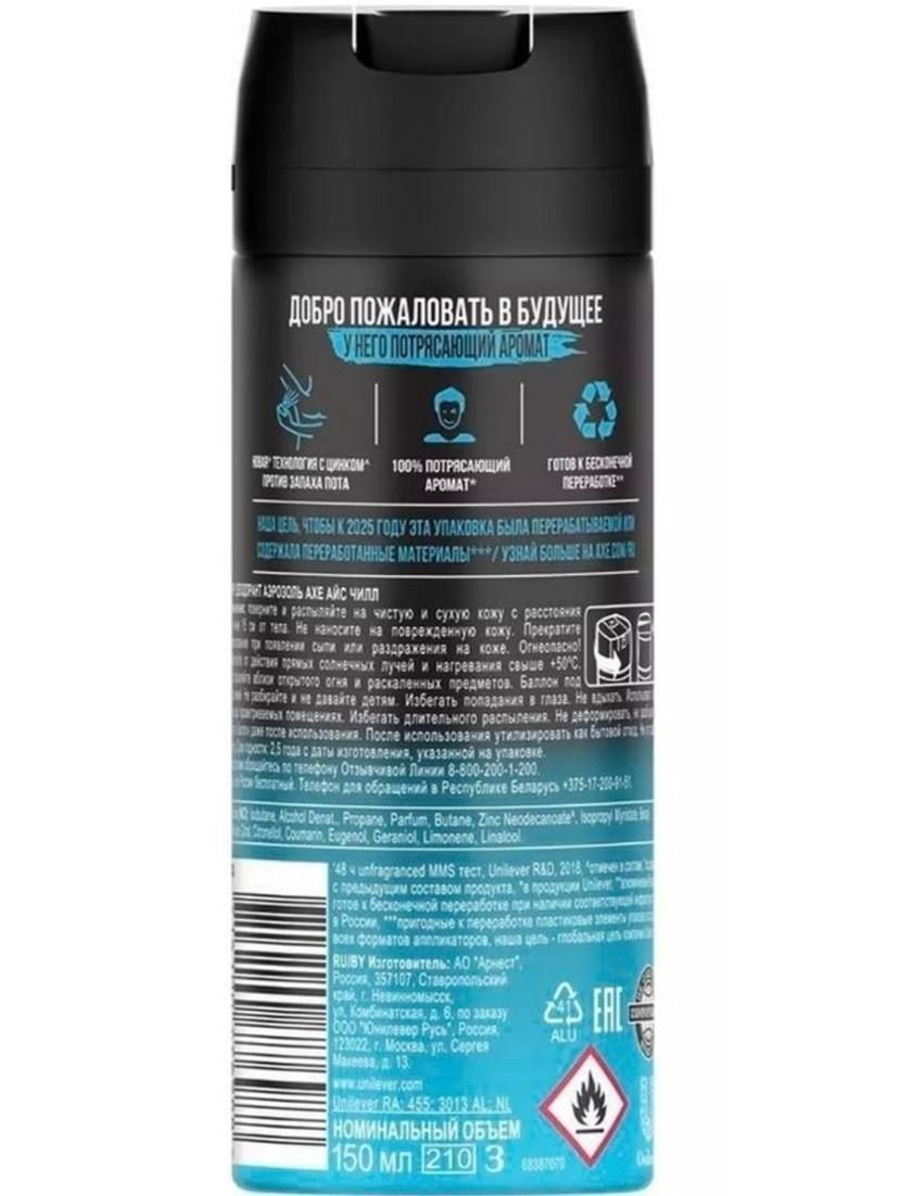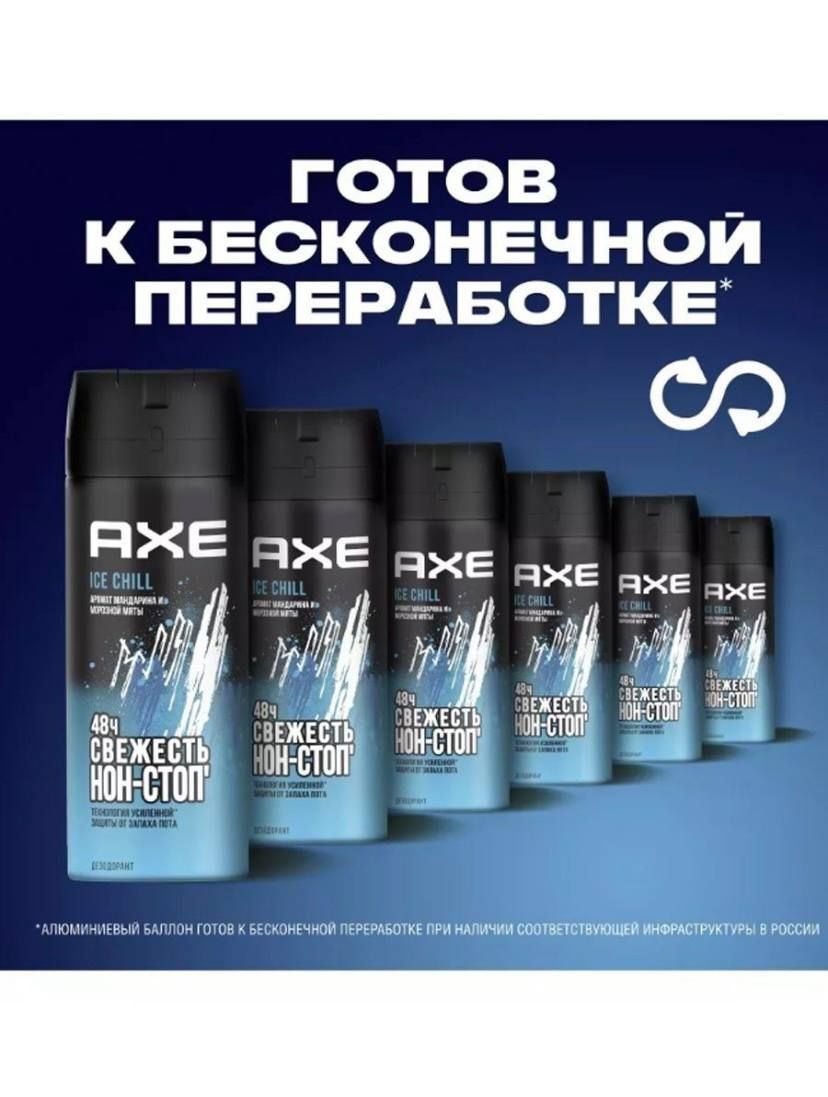 Описание: Хей, мэн, как насчет свежевыжатого мандаринового сока со льдом и нежными нотами пряных трав? AXE Ice Chill — супернаходка для самого горячего парня по ту сторону экрана.Мужской дезодорант спрей AXE Ice Chill — мощный коктейль для самого свежего начала дня! Революционная формула AXE 2в1 сочетает в себе топовый* аромат и защиту от запаха пота на 48 часов.В состав дезодоранта аэрозоля AXE мы добавляем цинк, который обеспечивает антибактериальный эффект. А значит, дезодоранты AXE для мужчин уничтожают не только запах пота, но и его причину. Этакий спидран с моментальным выходом на финального босса. И в этой катке у тебя есть мощный баф на 48 часов. Используй его по максимуму!Да, и еще. Речь о парфюмированном дезодоранте. AXE Ice Chill — это крышесносная композиция из ярких, свежих нот мандарина и морозной мяты.Попробуй AXE эффект!