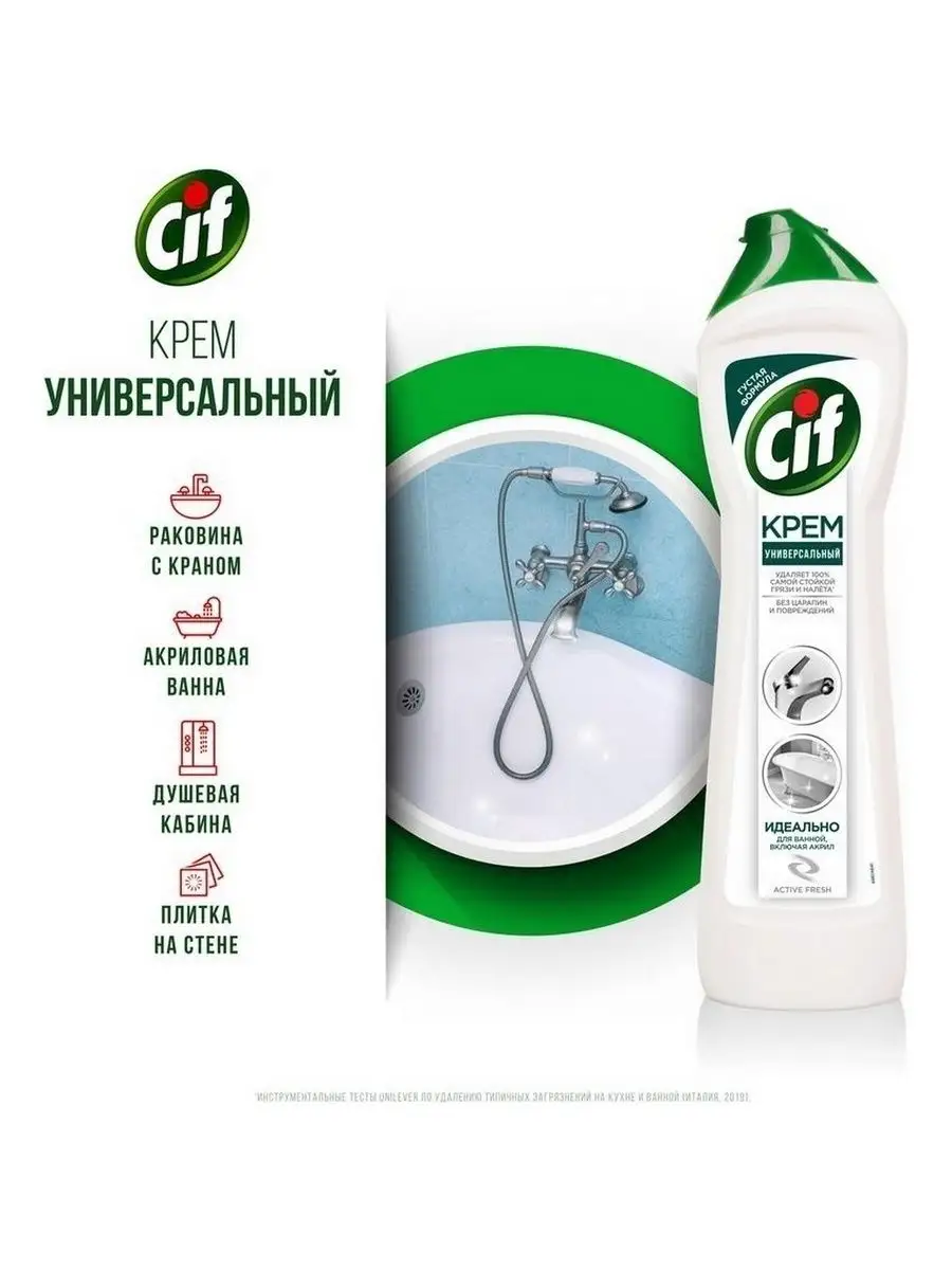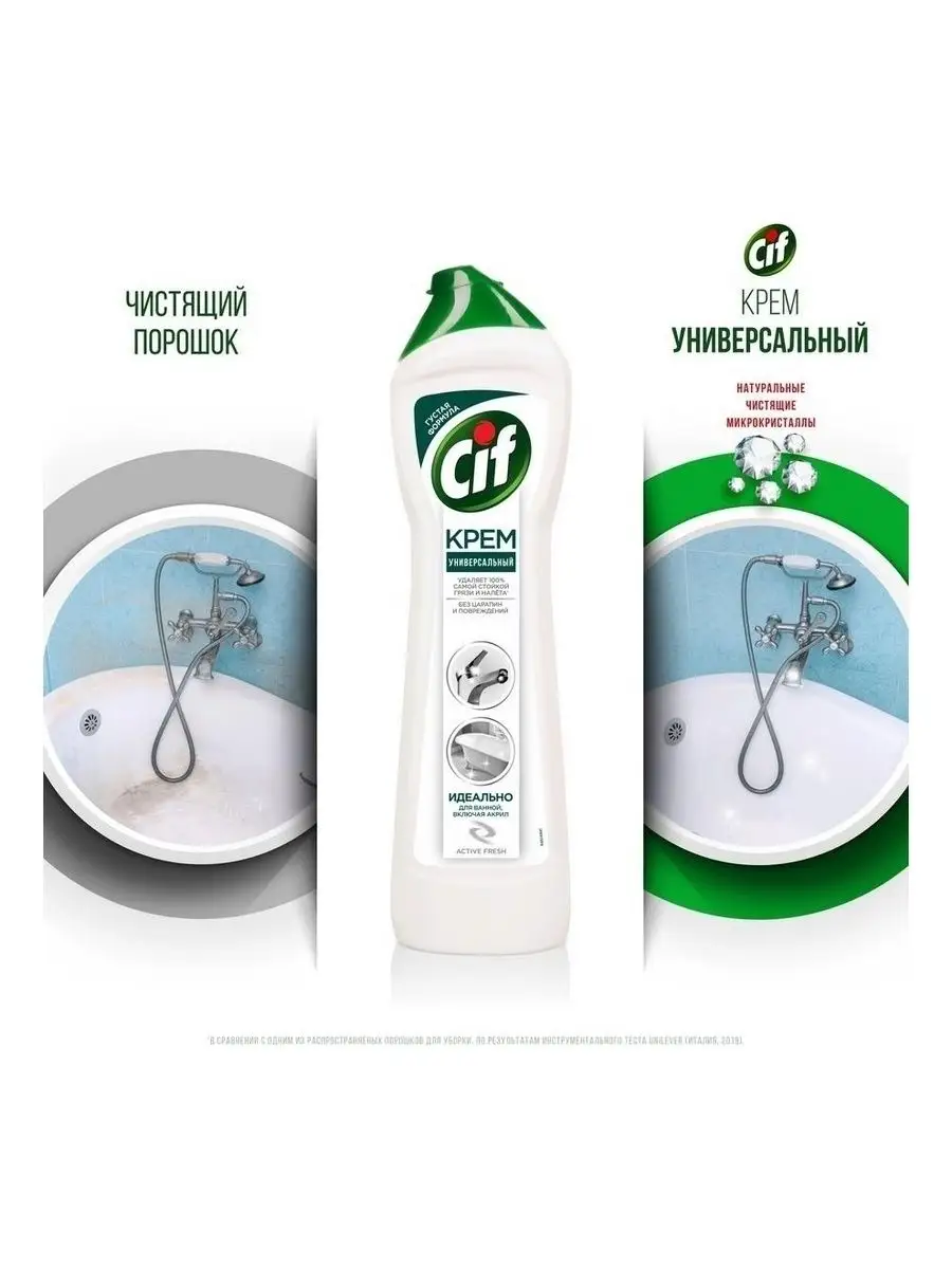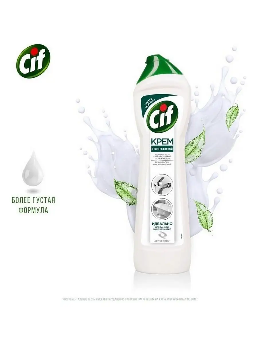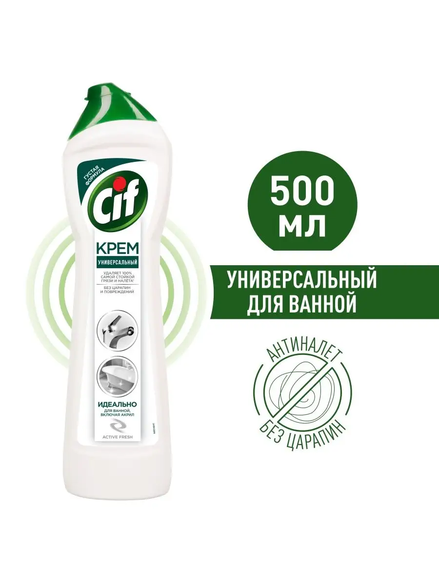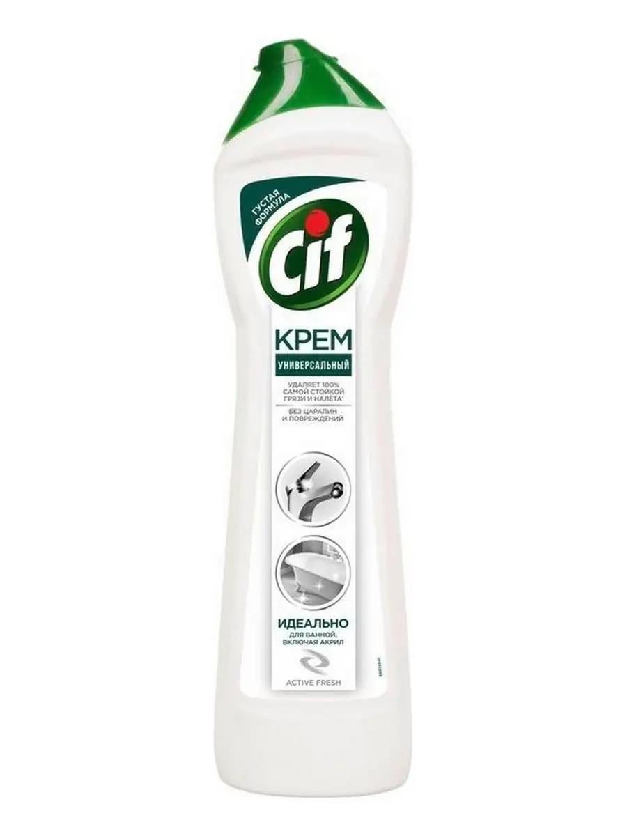 Описание: Пятна от зубной пасты, мыльные и известковые разводы, мыльный налет и ржавые потеки - поддерживать порядок в ванной комнате приходится постоянно. Благодаря эффективной формуле чистящего средства Cif Актив Фреш для ванной сияющая чистота быстро и без особых усилий - это реально.Cif подходит для чистки ванн, душевых кабин, раковин и кафеля. Улучшенный крем Cif безопасен для окружающей среды, имеет приятный аромат и не оставляет царапин и разводов.Обновленная формула Cif борется с налетом в ванной в 2 раза эффективнее*: кремовая текстура проникает вглубь пятен, а чистящие микрокристаллы устраняют их, не повреждая поверхности**.Cif - дом всегда красив!Обновленная линейка продуктов Cif - эффективные средства для уборки всего дома.*Инструментальные тесты Unilever, в линейке продукции Unilever**Инструментальные тесты Unilever (Италия, Россия, 2018-2020)