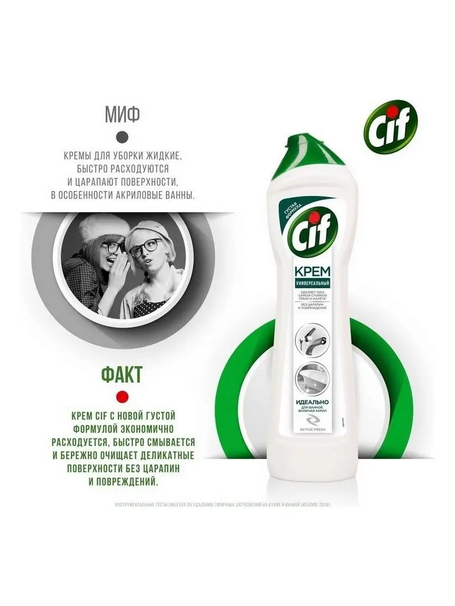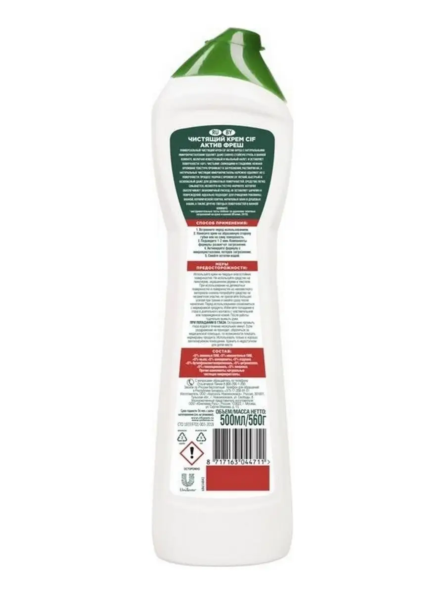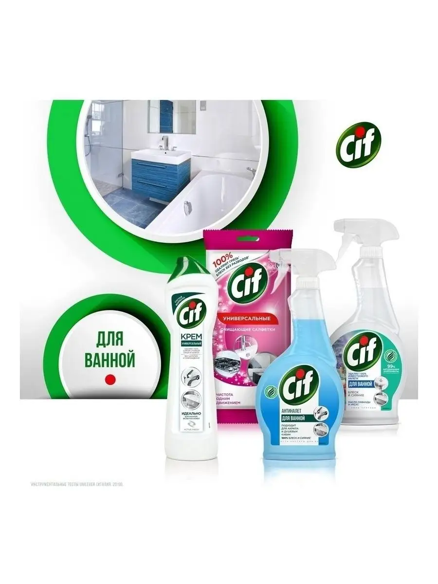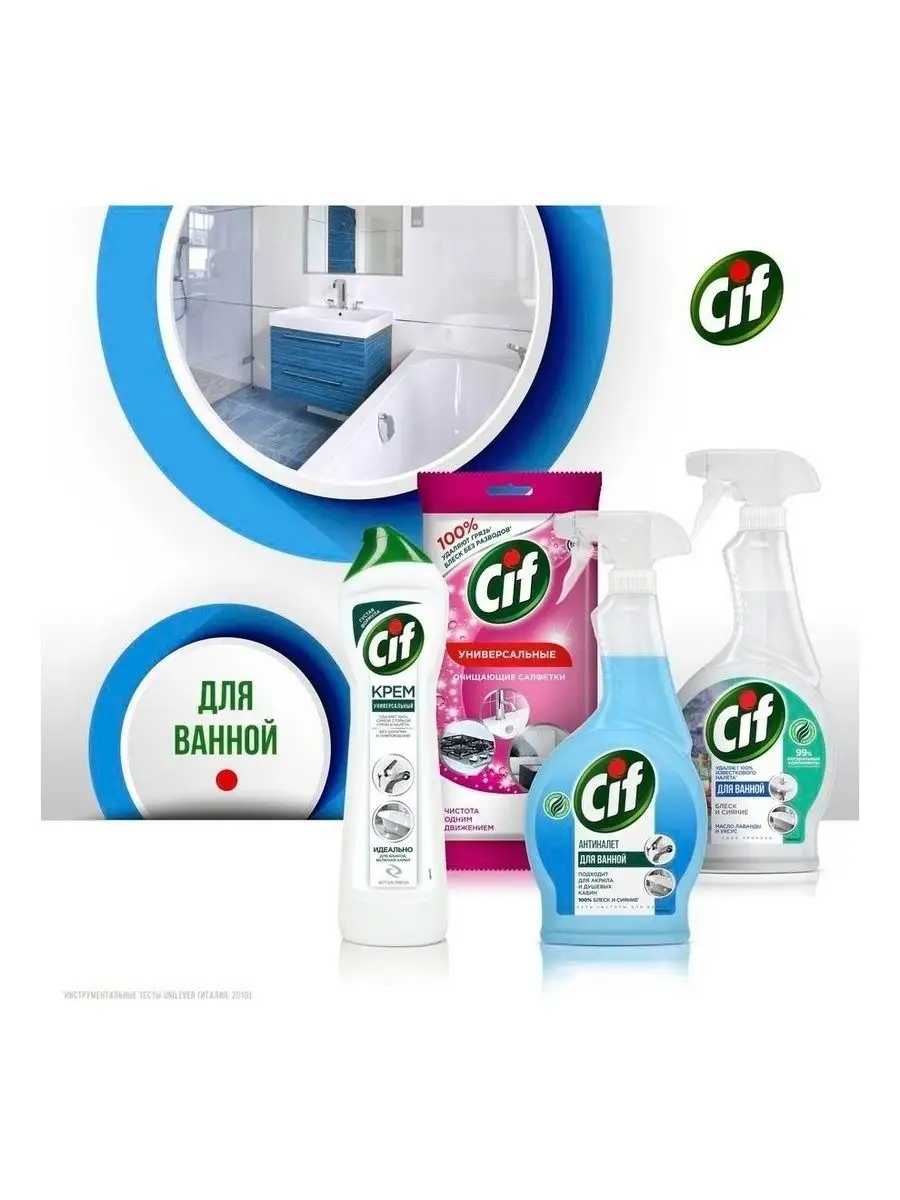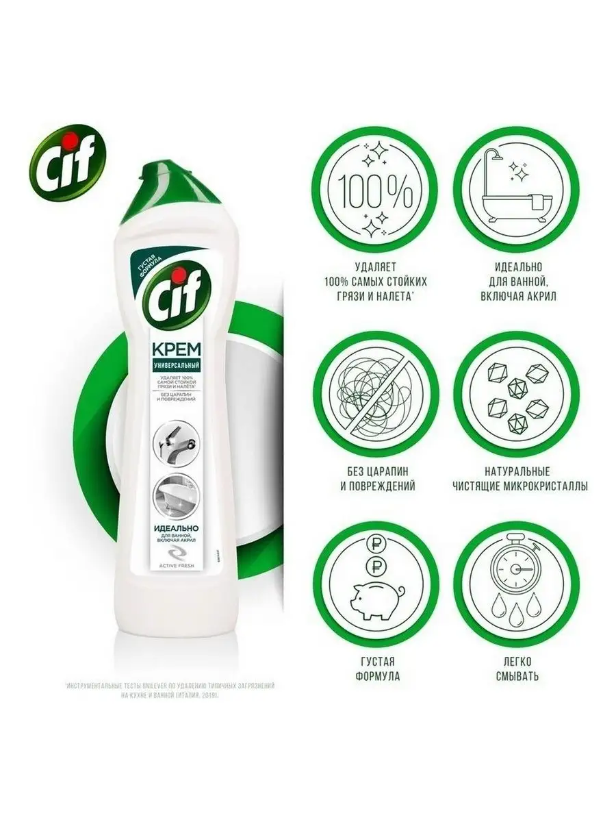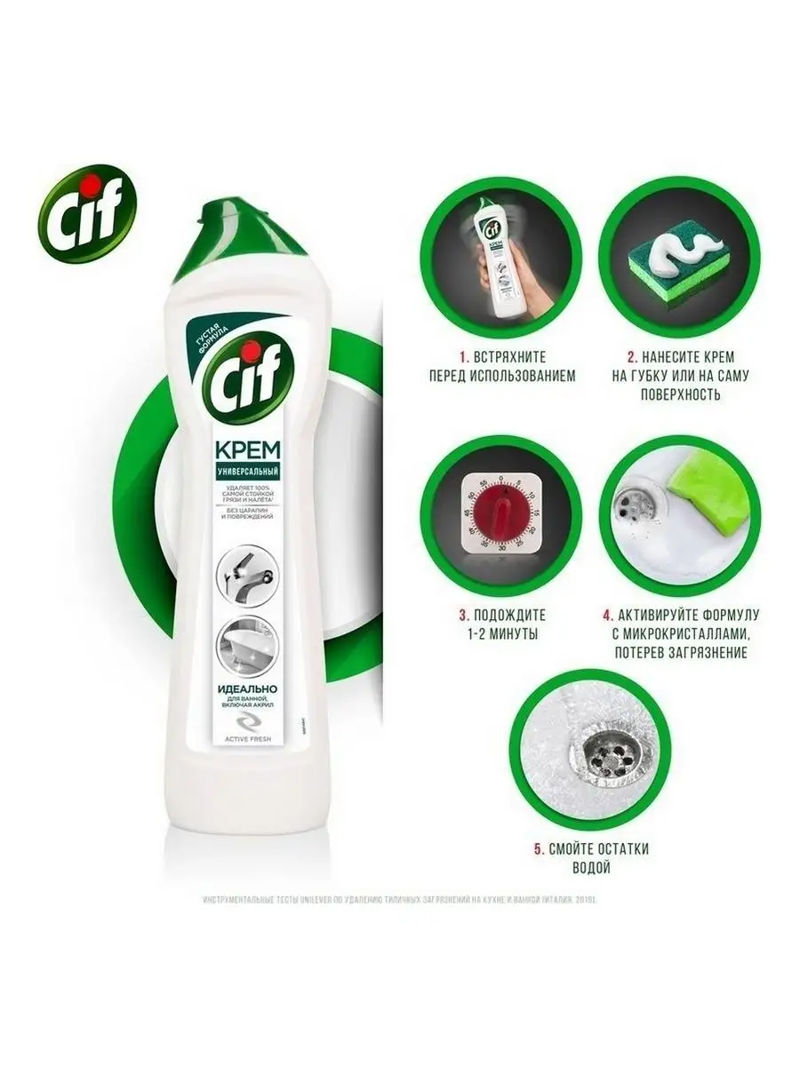 Описание: Пятна от зубной пасты, мыльные и известковые разводы, мыльный налет и ржавые потеки - поддерживать порядок в ванной комнате приходится постоянно. Благодаря эффективной формуле чистящего средства Cif Актив Фреш для ванной сияющая чистота быстро и без особых усилий - это реально.Cif подходит для чистки ванн, душевых кабин, раковин и кафеля. Улучшенный крем Cif безопасен для окружающей среды, имеет приятный аромат и не оставляет царапин и разводов.Обновленная формула Cif борется с налетом в ванной в 2 раза эффективнее*: кремовая текстура проникает вглубь пятен, а чистящие микрокристаллы устраняют их, не повреждая поверхности**.Cif - дом всегда красив!Обновленная линейка продуктов Cif - эффективные средства для уборки всего дома.*Инструментальные тесты Unilever, в линейке продукции Unilever**Инструментальные тесты Unilever (Италия, Россия, 2018-2020)
