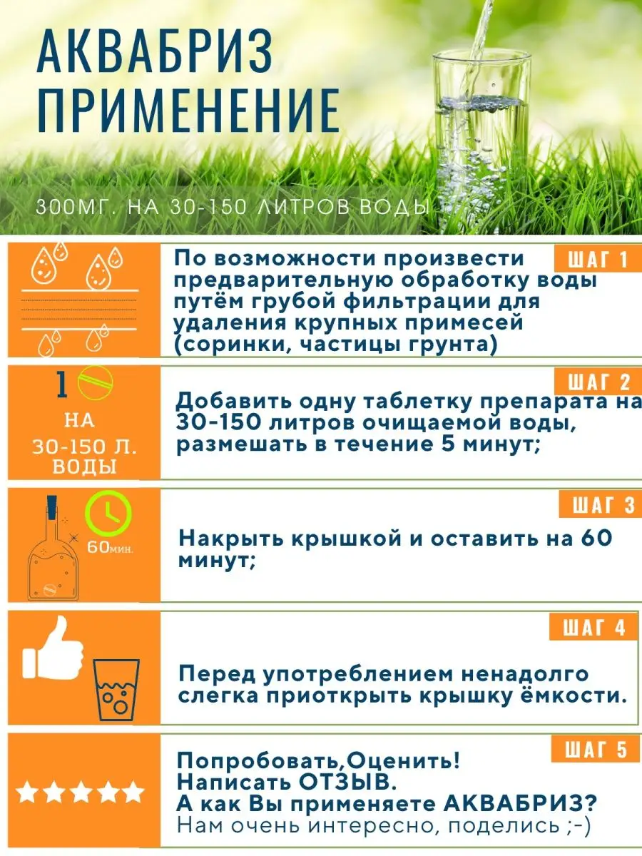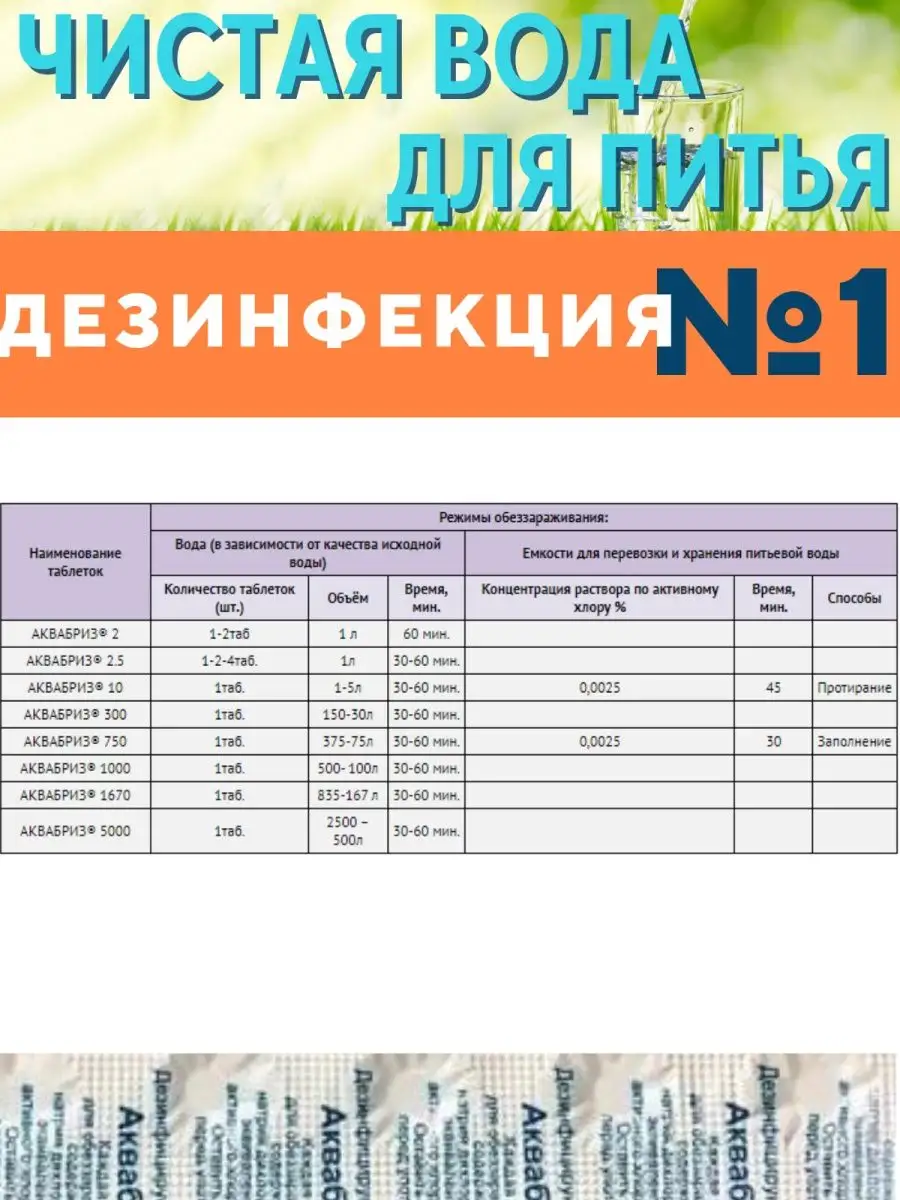 Описание: # Таблетки для обеззараживания воды, 300мг. 1 банка, 1100 табл./ Хлорные таблетки для дезинфекции воды / Дезинфицирующие средства для поверхностей, предметов, текстильных материалов. Фильтр для воды в банке содержится примерно 1100 таблеток. В зависимости от степени загрязнения воды, одна таблетка рассчитана на обеззараживание питьевой воды 30-150 литров. - ОББЕЗЗАРАЖИВАНИЕ ВОДЫ (рек,озер,прудов и т.д.) в полевых и экстремальных условиях, в чрезвычайных ситуациях; - ОЧИСТКА ВОДЫ ДЛЯ МЫТЬЯ ОВОЩЕЙ, ФРУКТОВ, ЗЕЛЕНИ; - ДЕЗИНФЕКЦИЯ ЕМКОСТЕЙ для питьевой воды; - Длительность срока хранения хлорка втаблетках (5 лет); - Универсальность назначения (дезинфекция воды,воздуха; хлорные таблетки для уборки: тары, белья, генеральная уборка любого помещения и всех предметов из любого материяла; ). **Таблетки "Аквабриз" предназначены для обеззараживания питьевой воды и открытых источников, содержащей бактерии и вирусы, по эпидпоказаниям. Убивает** бактерии, вирусы, патогенные грибы.