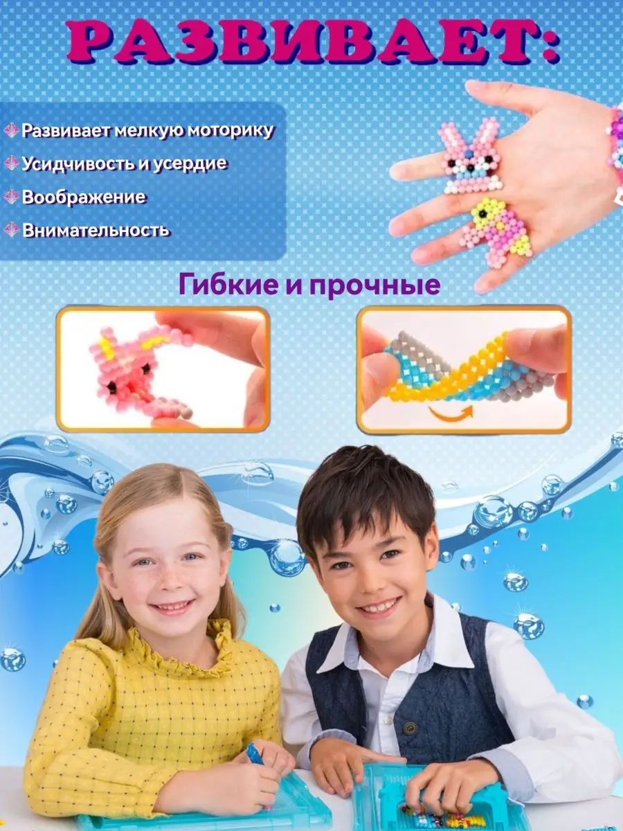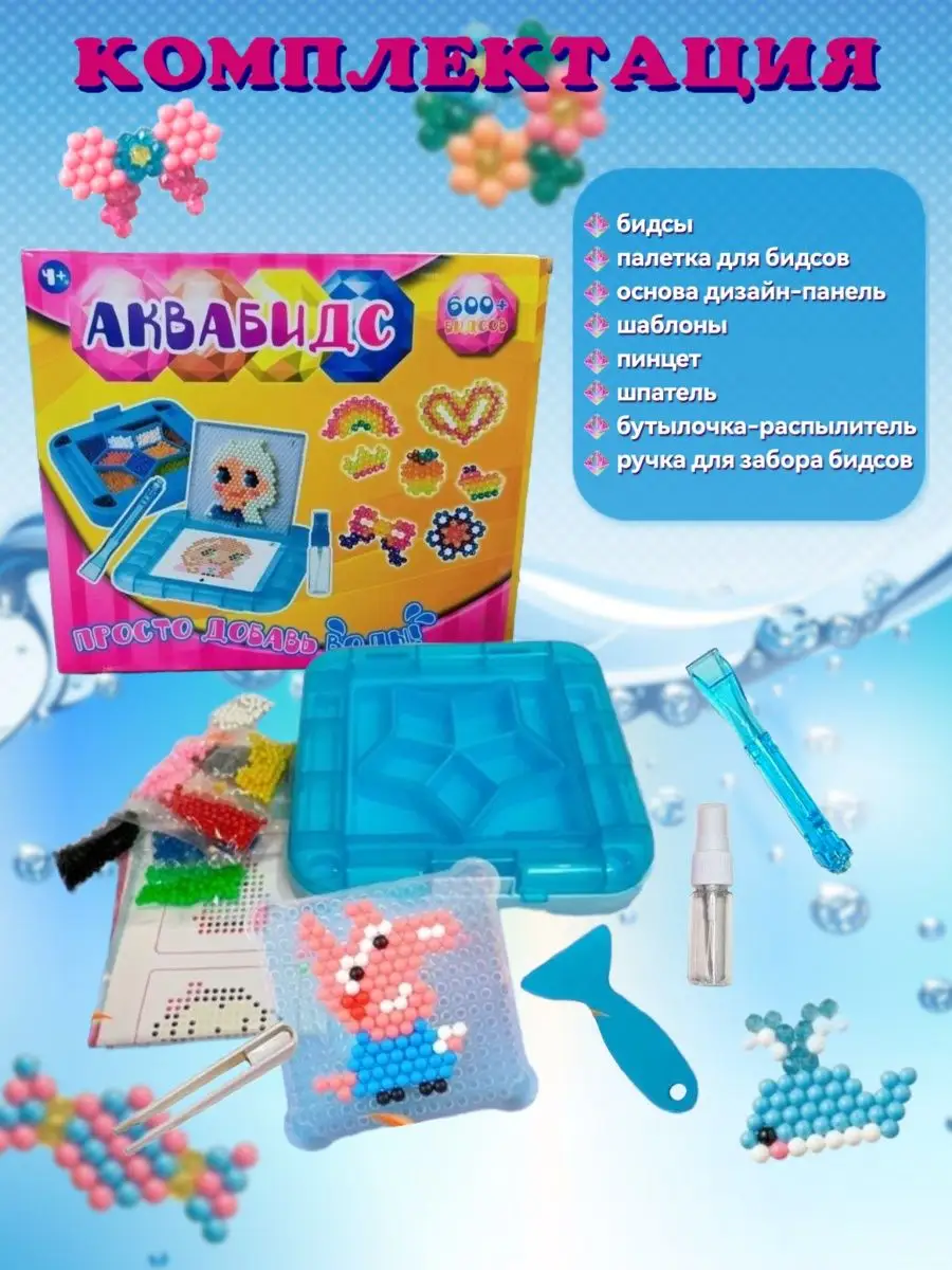 Описание: Реализуйте любые творческие идеи вместе с ребенком! Создавать зверюшек, сладости или цветы из бусин теперь сможет каждый вместе с набором для творчества и рукоделия Аквамазаика. Благодаря необходимым аксессуарам обычные бусины с легкостью превращаются в яркие и уникальные игрушки!В развивающем для детей наборе есть все, что нужно для создания фигурок. Выберите один из шаблонов, положите его в прозрачную форму и выложите бусины по шаблону. Затем распылите на бусины воду, переверните форму и дождитесь высыхания игрушки. Игрушка готова! Используйте ее и для игр, и для украшения. Бусины крепко соединяются после контакта с водой. Все необходимые аксессуары включены в набор, докупать ничего не нужно.Бусины удобно хранить в палитре, чтобы они не потерялись.В комплекте есть мелкие детали; не разрешается использовать для детей младше 5 лет.В игровой набор "Чудесные бусы" входит:- 1400 бусин, 14 цветов- 2 пинцета- Палитра- Бутылочка-распылитель для воды- Форма-трафарет- Аксессуары для изготовления брелков- Шаблоны с рисунками. В набор для творчества "Аквабидс" входит:- Палитра- Пинцет 1 штука-600 бусин - Бутылочка-распылитель для воды- Форма-трафарет- Шаблоны с рисунками- Лопатка для снятия готовых фигур с трафаретаВ набор для рукоделия "Аквамазаика" входит:- 1000 бусин, 10 цветов- Бутылочка-распылитель для воды- Палитра- 2 пинцета- Форма-трафарет- Лопатка для снятия готовых фигур с трафарета