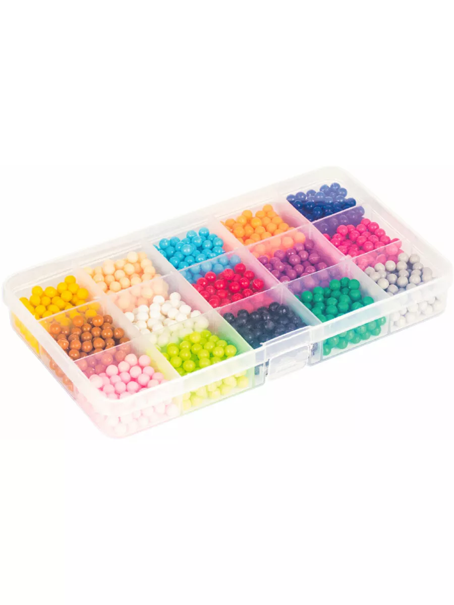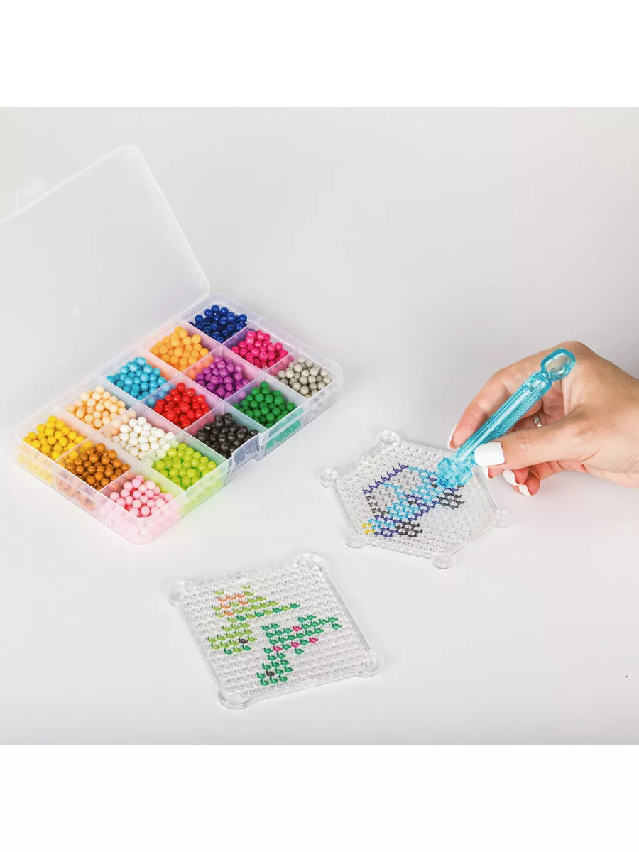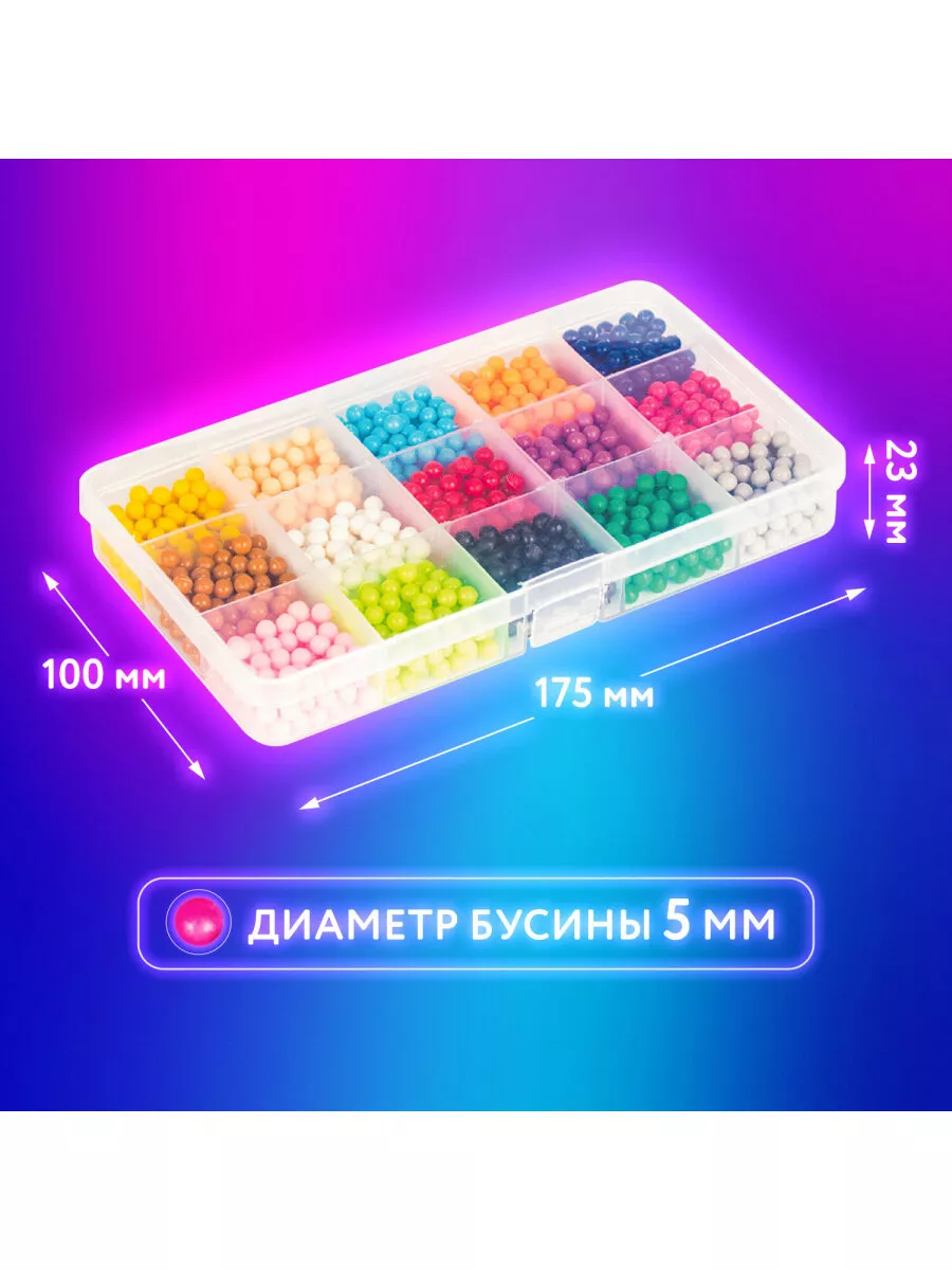 Комплектация бусины, пластиковый контейнер; подставка-трафарет - 2 шт., кисть - 8 шт., пульверизатор; ручка для аквамозаики, лопатка