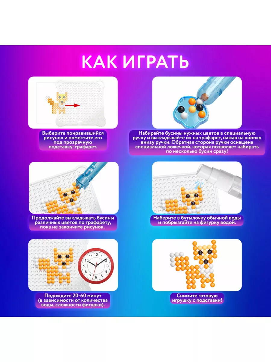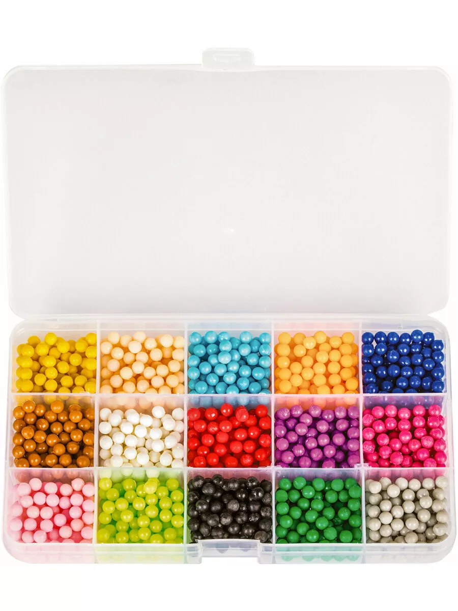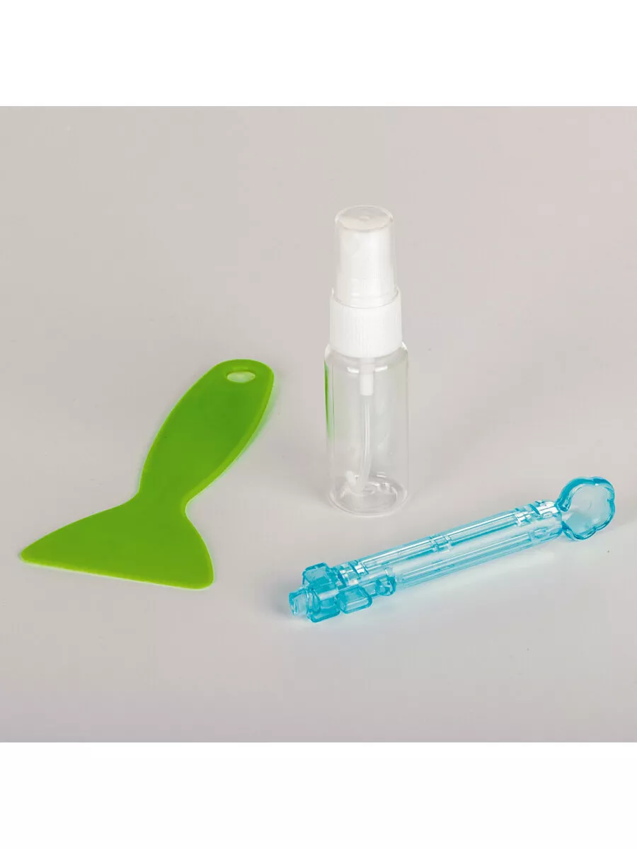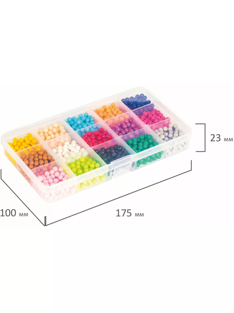 Комплектация бусины, пластиковый контейнер; подставка-трафарет - 2 шт., кисть - 8 шт., пульверизатор; ручка для аквамозаики, лопатка