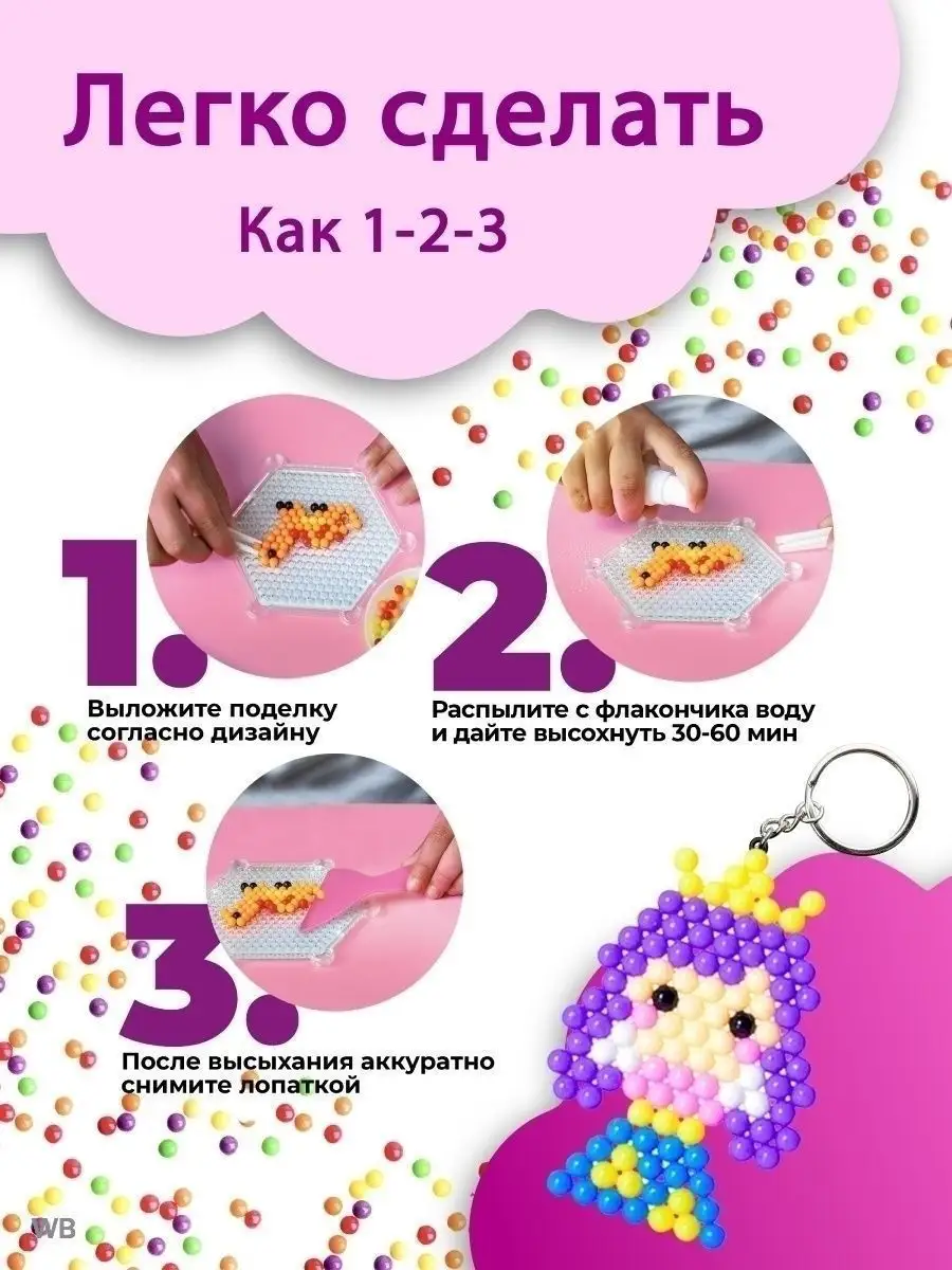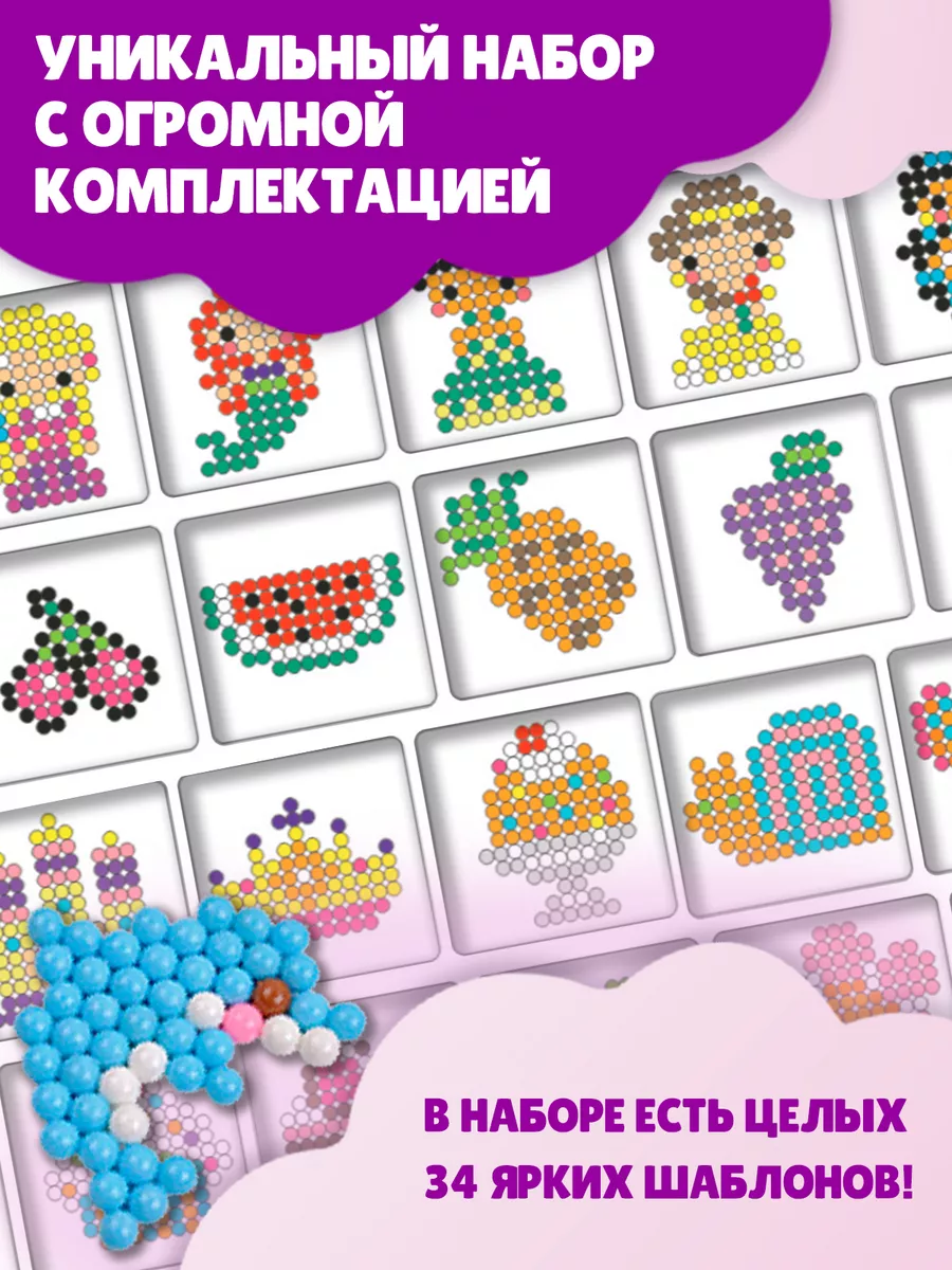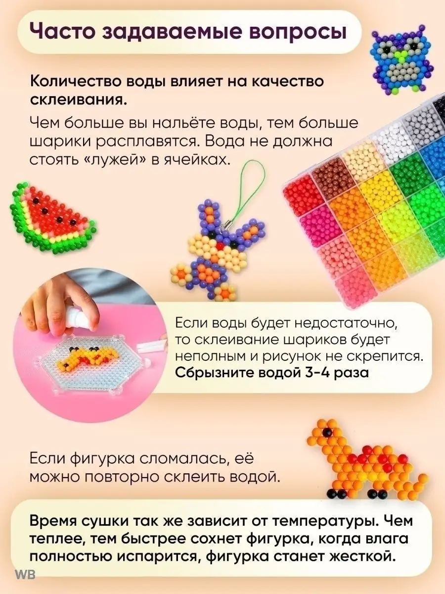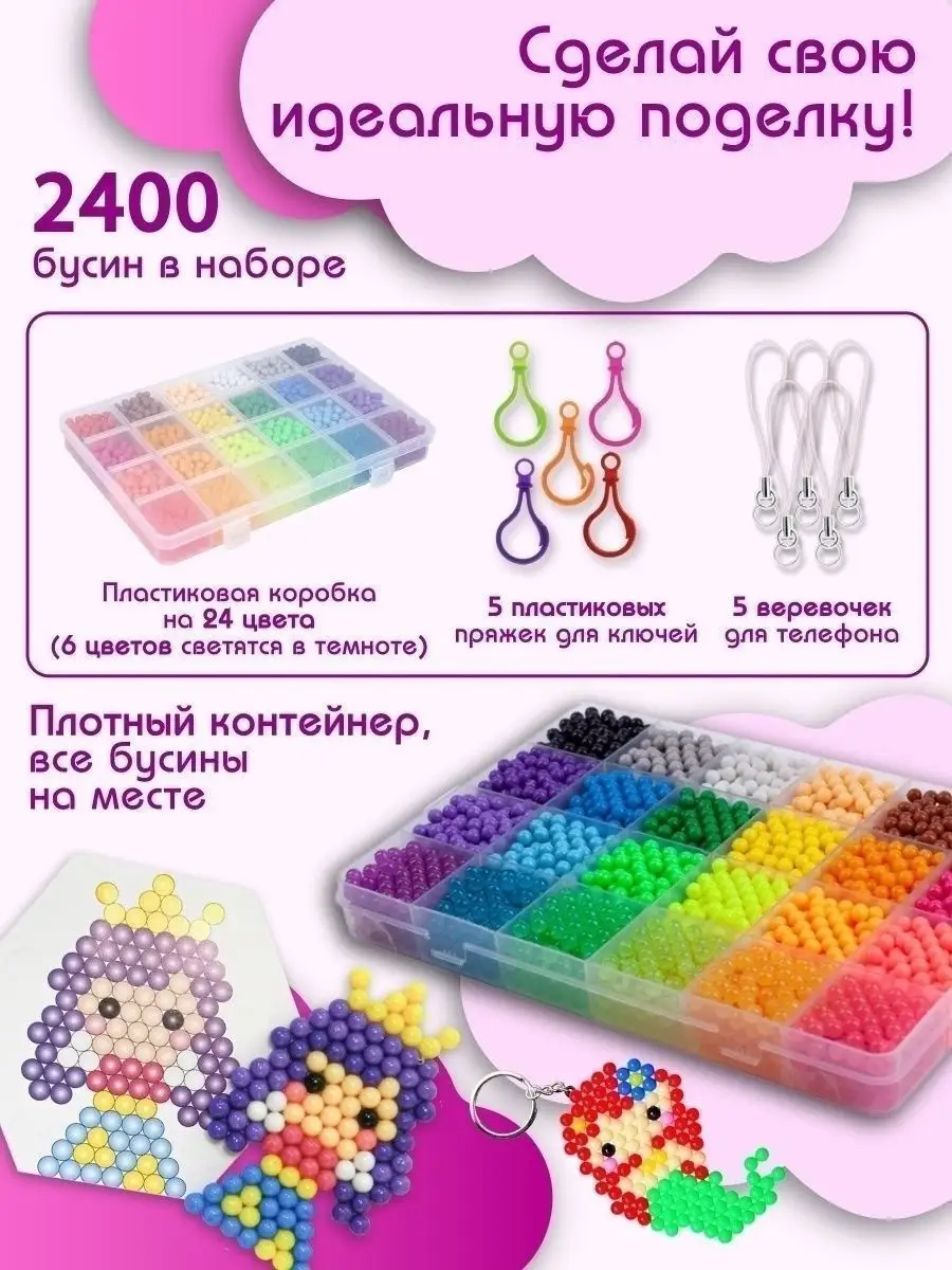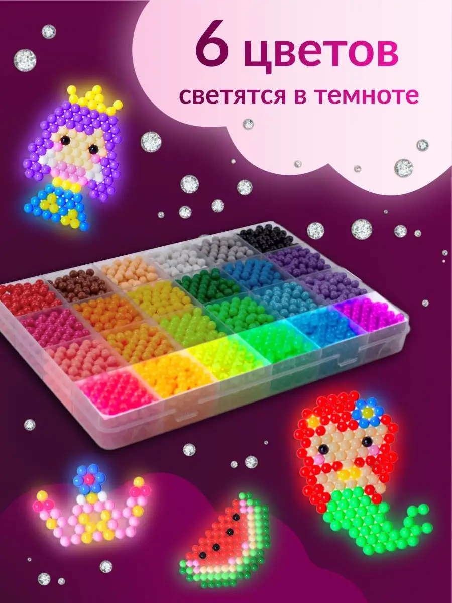 Количество элементов аксессуары и инструкция (собери-сложи по образцу); красочных шаблоны, формы для выкладки бусин; водные бусины (24 цвета, 6 светятся в темноте)