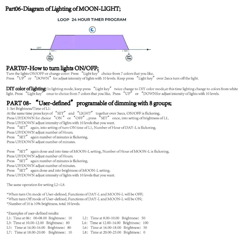 2. С 8 наборами настроек яркости времени, переключатель таймера, имитирует другой переключатель яркости природы. 3. Имитируйте восход и закат, чтобы обеспечить естественный дневной и ночной цикл для вашей рыбы.