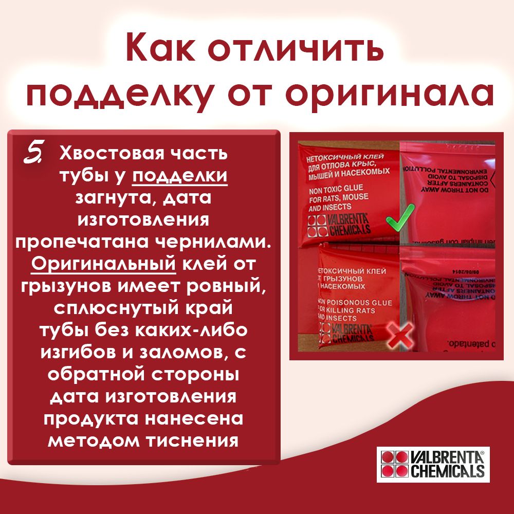 Разная плотность и срок службы. К сожалению, это отличие можно заметить только после использования клея. Оригинальный продукт очень тягучий, такая консистенция нужна для того, чтобы крыса увязала. Клей не застывает и не теряет свойств до 6 лет. Подделка более плотная и довольно быстро полимеризуется (застывает), нередко еще до того, как успеет подействовать.