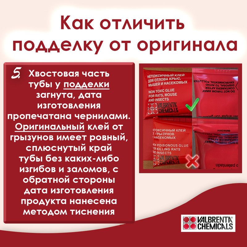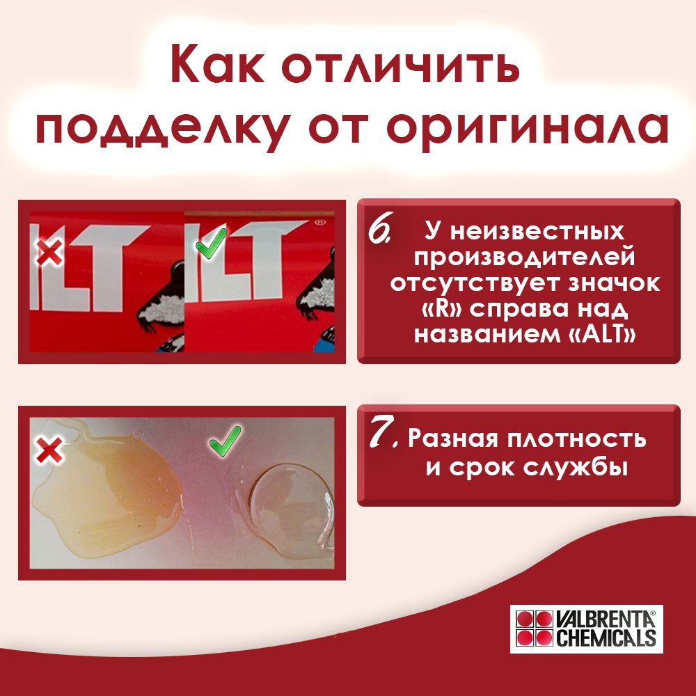 Хвостовая часть тубы у подделки загнута, дата изготовления пропечатана чернилами. Оригинальный клей от грызунов имеет ровный, сплюснутый край тубы без каких-либо изгибов и заломов, с обратной стороны дата изготовления продукта нанесена методом тиснения.У неизвестных производителей отсутствует значок «R» справа над названием «ALT» на тубе. Поддельные товары не имеют обозначения зарегистрированной торговой марки, тогда как на оригинальном продукте этот символ есть обязательно.