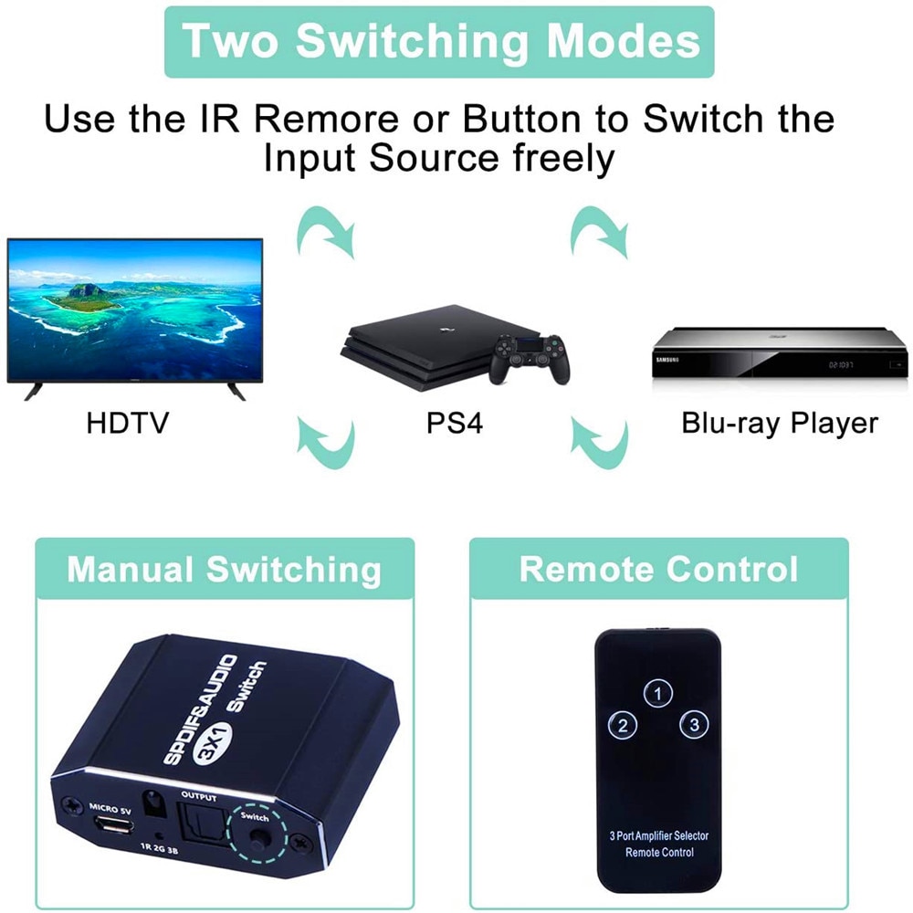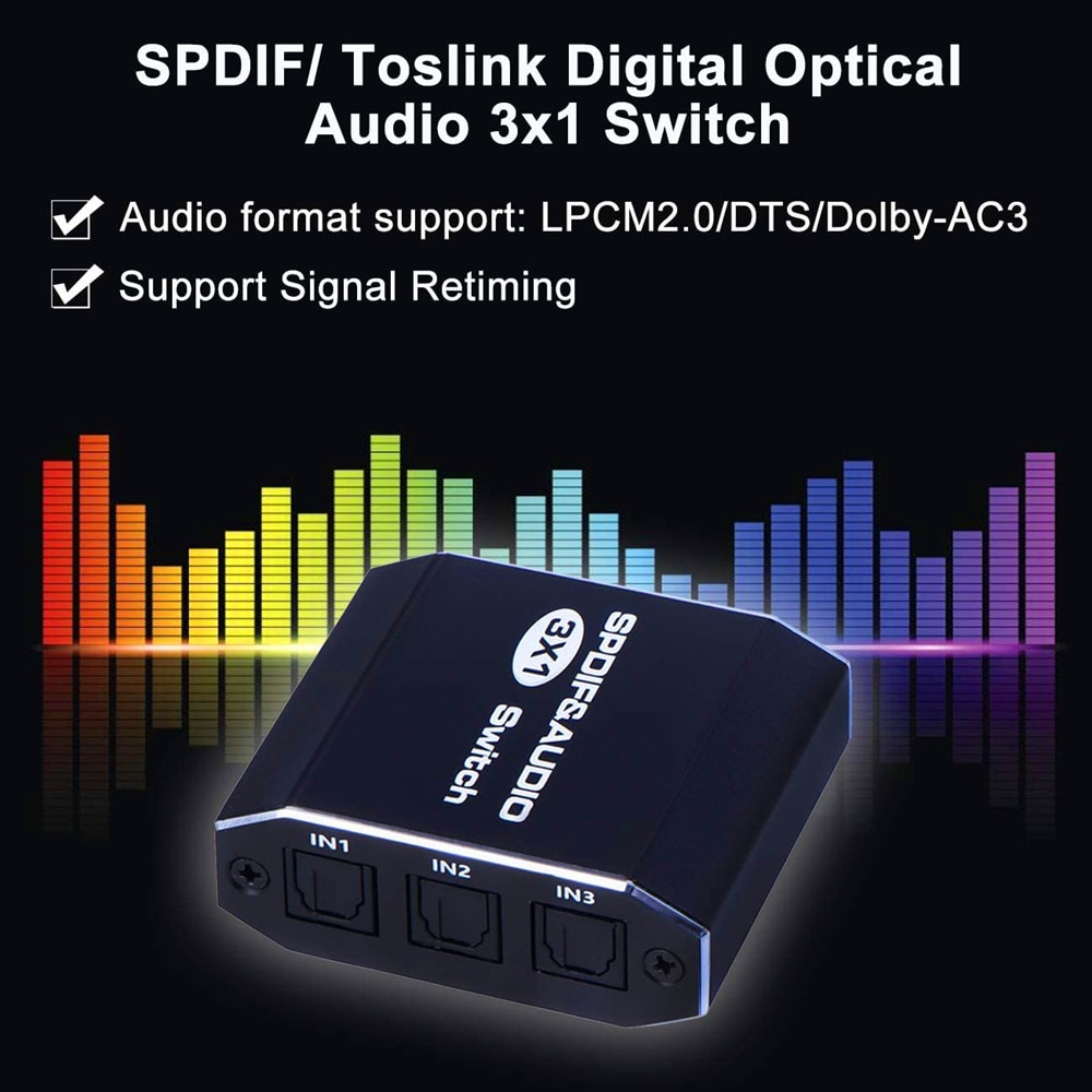 • Этот переключатель Toslink переключает три цифровых оптических аудиосигнала SPDIF (Toslink) на один выход. Он позволяет подключить три одиночных оптических источника звука,