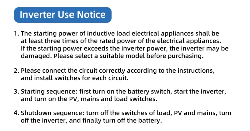 A: Если бытовая техника содержит приборы с индуктивной нагрузкой, такие как холодильники, стиральные машины, кондиционеры и т. Д., мощность инвертора как минимум в три раза превышает общую мощность устройств индуктивной нагрузки, в противном случае устройства могут не запуститься.