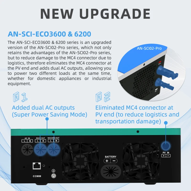 (Двойной MPPT) , По-прежнему с двойным входом PV и двойным выходом переменного тока, а недавно разработанный цветной дисплей используется во всей серии.