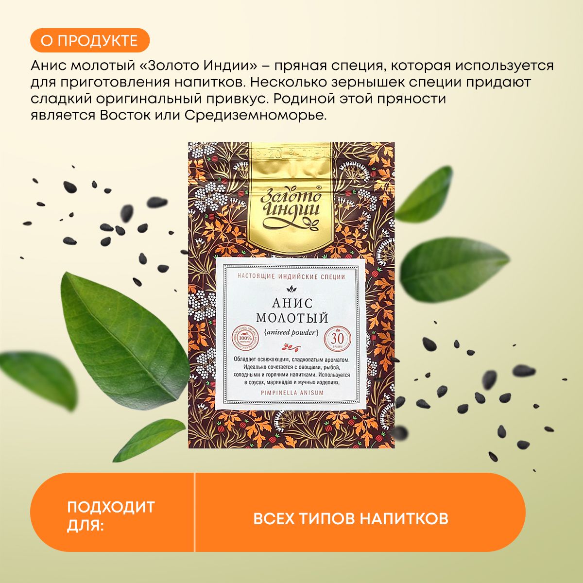 Описание: Анис – одна из самых полезных приправ. Она содержит микро- и макроэлементы, углеводы, жирные кислоты и белки. Благодаря этому часто используется в кулинарии и медицине. Эти семена имеют сладковатый и освежающий привкус, поэтому хорошо сочетаются с овощами и мясом. Специю можно добавлять в салаты, использовать во время засолки или квашения, также она хорошо сочетается с выпечкой.