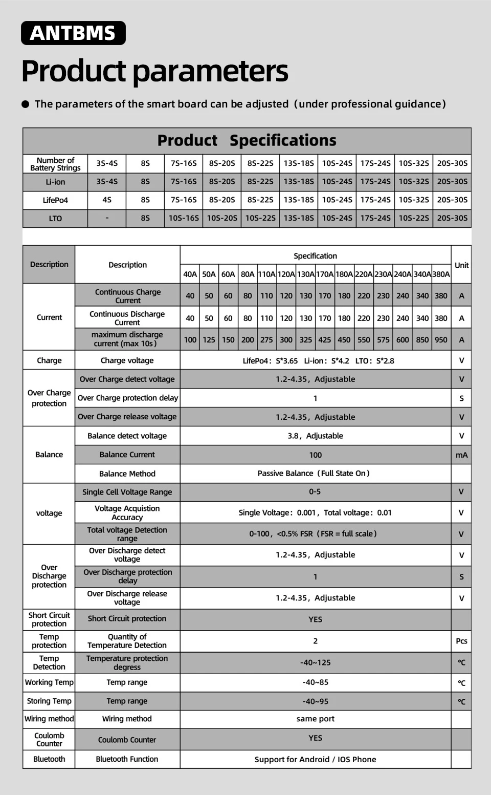 ANT SMART BMS 7S to 16S 8S to 20S 22S Lifepo4 Li-Ion Lto 18650 аккумулятор 80A 325A 450A 600A Встроенный Bluetooth 10S 13S 14S баланс