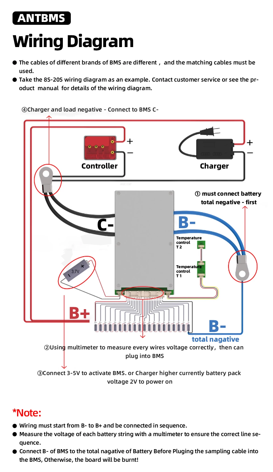 ☆ Подключите B- of BMS к общему минусу батареи перед подключением кабеля выборки к BMS, в противном случае плата сгорит