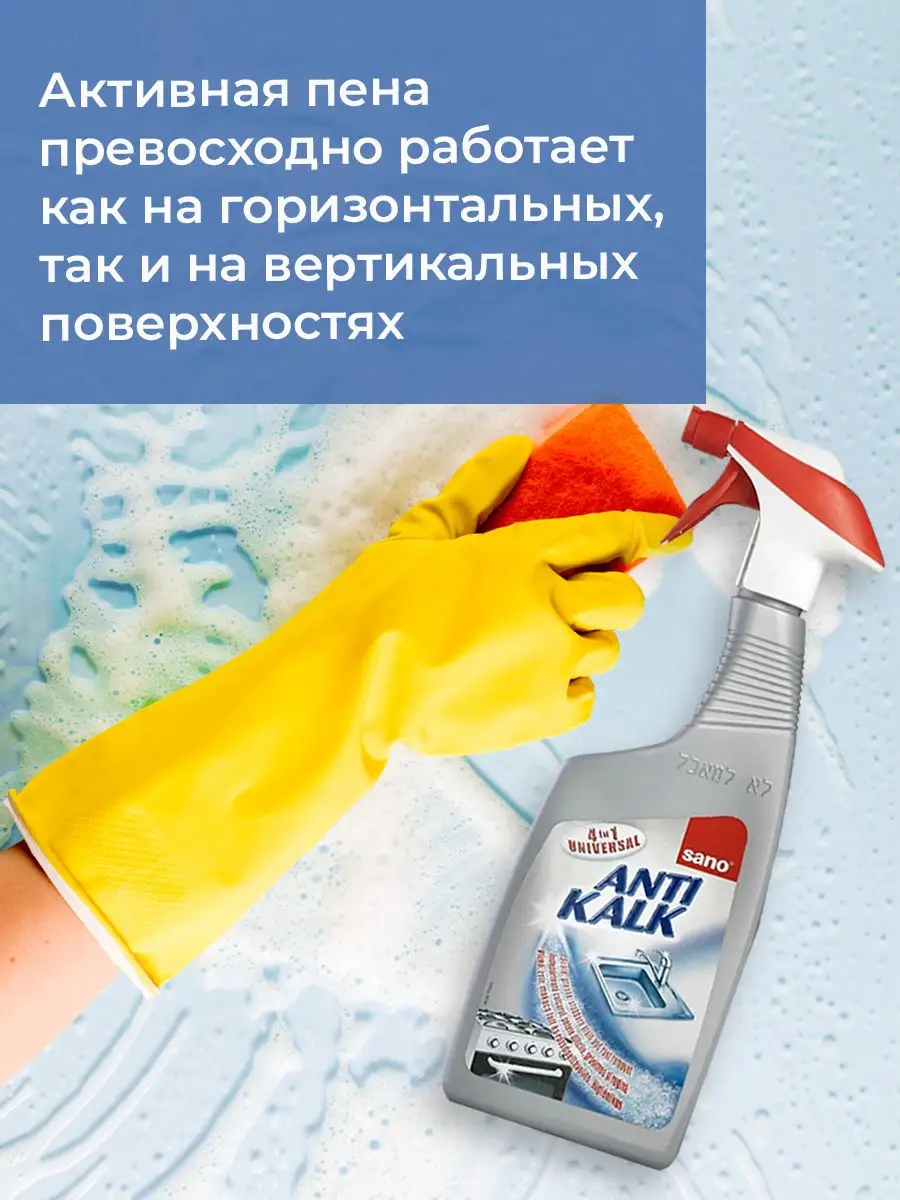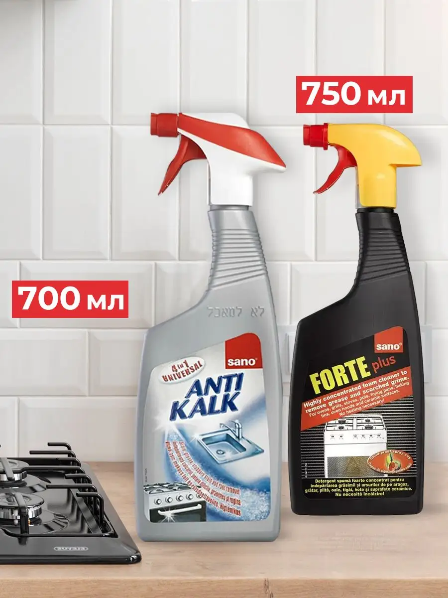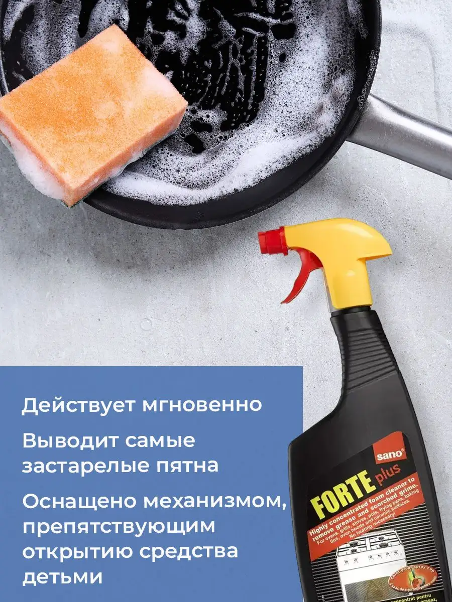 Описание: Многофункциональное средство для удаления камня, ржавчины и жира, Anti Kalk Sano 4 в 1, 700 мл. Многофункциональное высокоэффективное средство для удаления камня, ржавчины, известкового налета и холодного жира 4 в 1. С легкостью очищает краны, сантехнику, керамическую плитку, предметы из пластмассы, стекла и других поверхностей. Активная пена превосходно работает как на горизонтальных, так и на вертикальных поверхностях. Проста и удобна в применении. Концентрированное средство для чистки духовок Сано Форте Sano Forte Plus, 750 мл. Высококонцентрированное пенящееся чистящее средство Sano Forte для удаления жира, сажи и копоти.