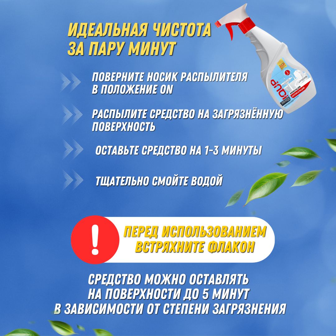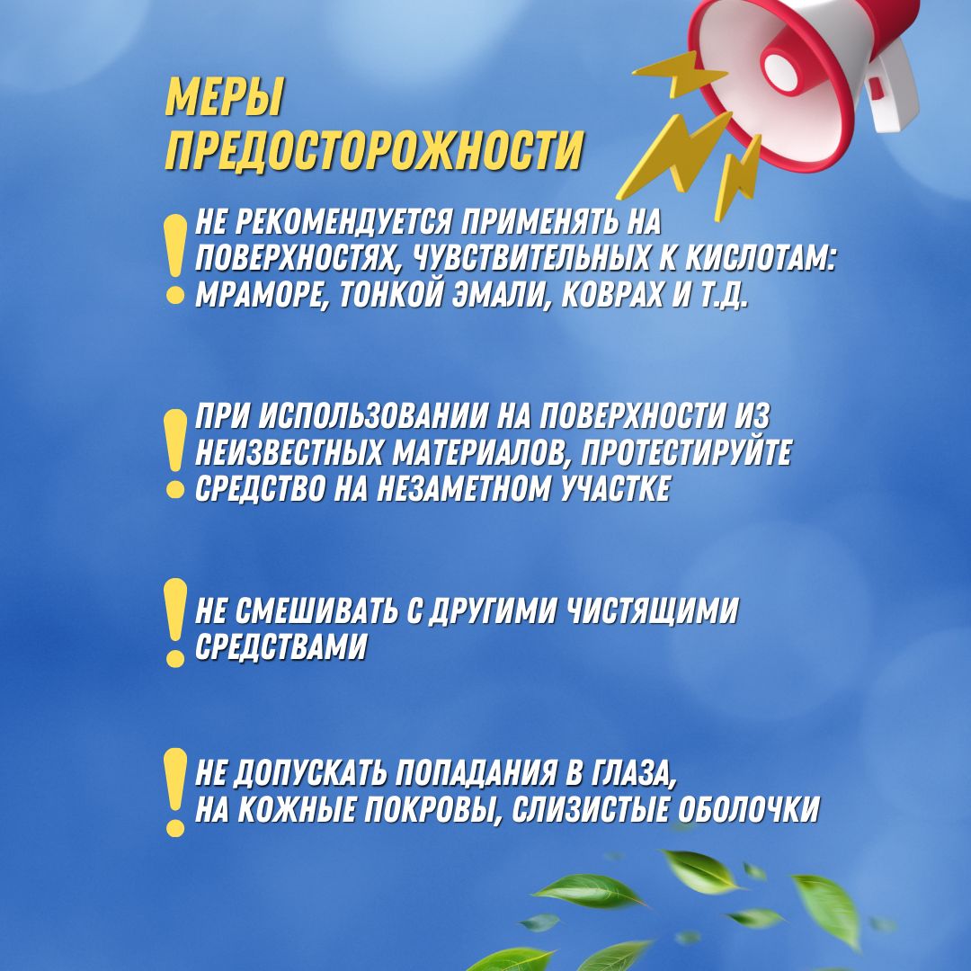 Описание: Антикальций спрей IQUP - чистящее средство против известкового налета, от накипи и минеральных отложений. Он не только удаляет ржавчину и известковый налет, но и придает поверхностям сияние и блеск. Удобный способ нанесения позволит очистить сантехнику в самых труднодоступных местах. Средство для сантехники убирает следы ржавчины, мыльные загрязнения. Спрей для сантехники предназначен для чистки ванны, раковины и душевых кабин. Экономный расход чистящего средства позволит вам дольше наслаждаться чистотой и белизной вашей сантехники. Жидкое средство для ванны и туалета очищает и дезинфицирует поверхности и предметы. Чисто за 30 секунд! Это средство для сантехники не только эффективно чистит, но и предотвращает образование новых отложений. Спрей для унитаза и туалета: средство от ржавчины обеспечивает надежное удаление известкового налета и следов ржавчины, предотвращая их накопление в унитазе и на поверхностях туалета. Средство для мытья ванны поможет с уборкой - антиржавчина обеспечивает бережное очищение ванн и сантехники, не повреждая поверхности и предотвращая потерю блеска со временем, подходит для акриловых ванн, для чугунных ванн.