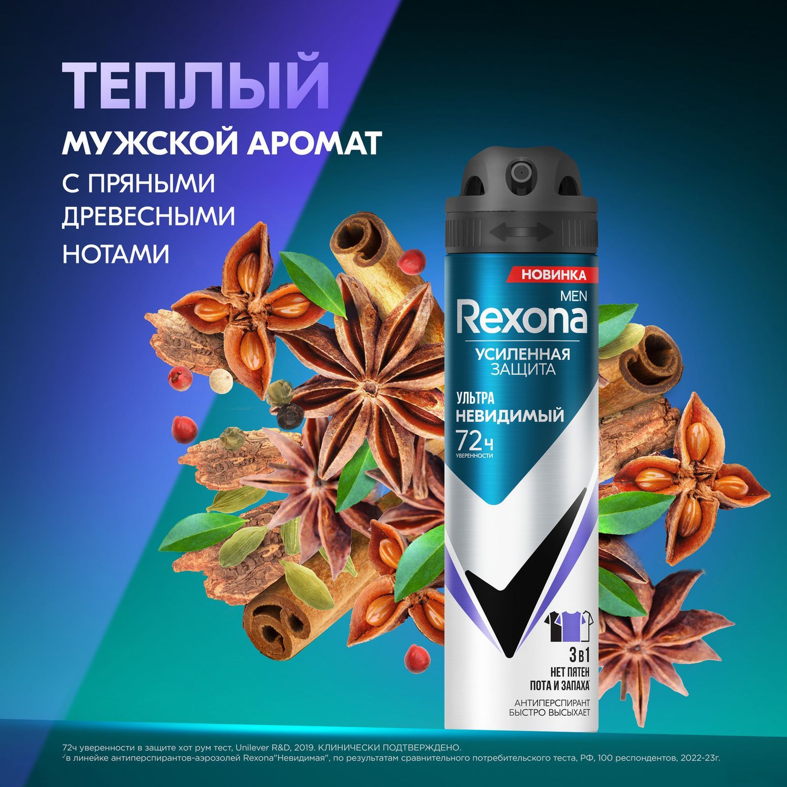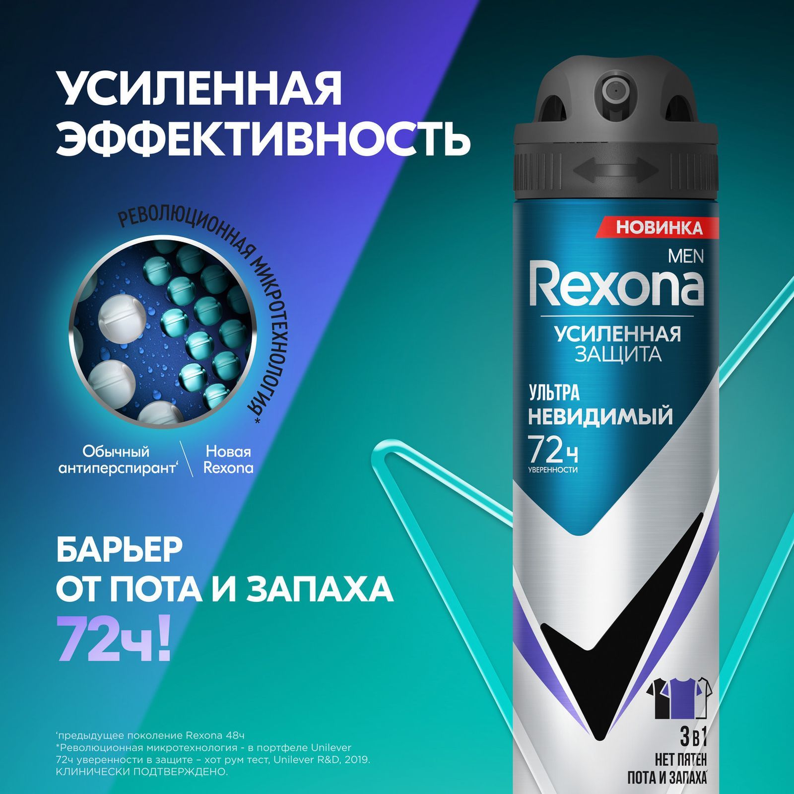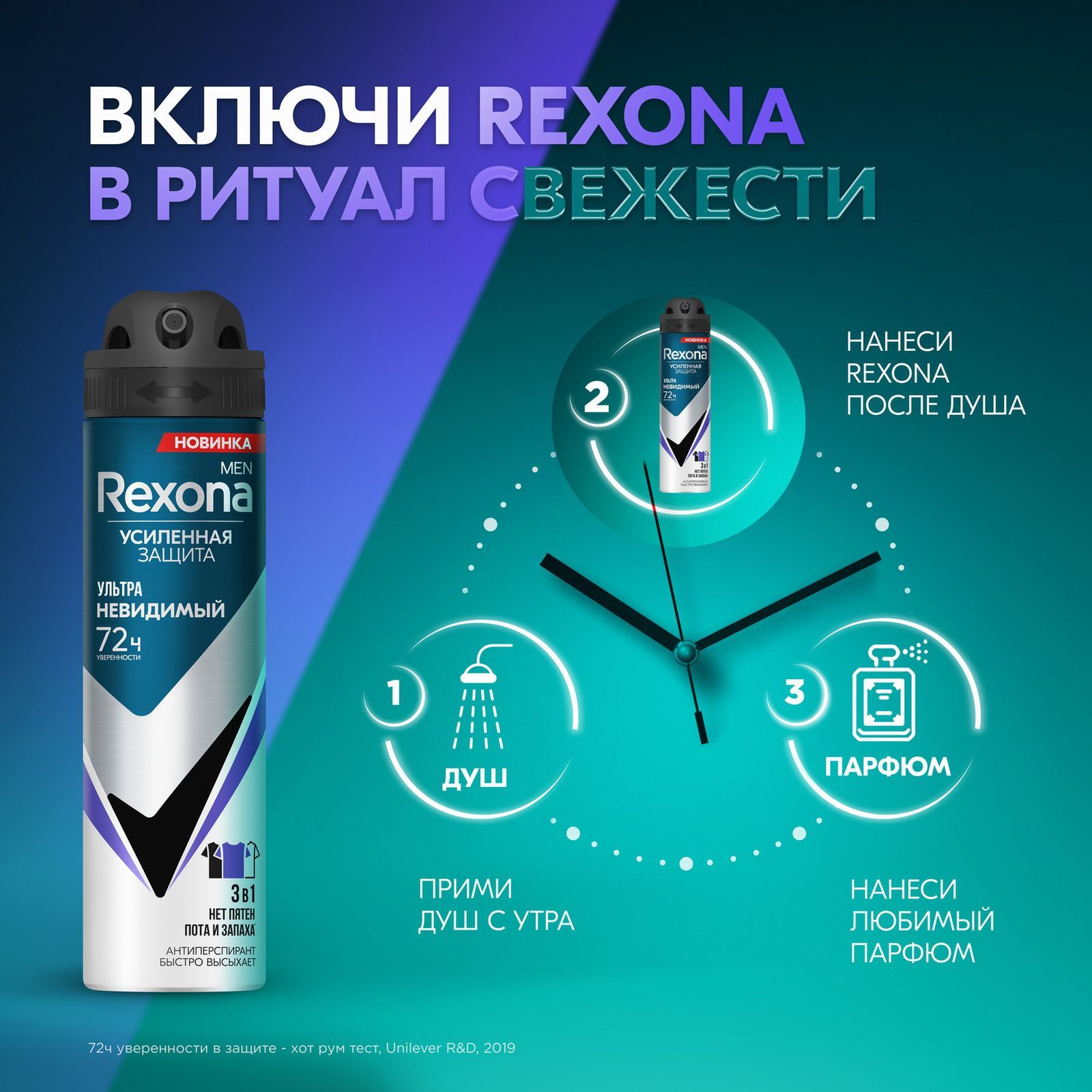Антиперспирант-аэрозоль Rexona Men УЛЬТРАНЕВИДИМЫЙ, 72 ч уверенности, 3 в 1, нет пятен, пота и запаха, 150 мл