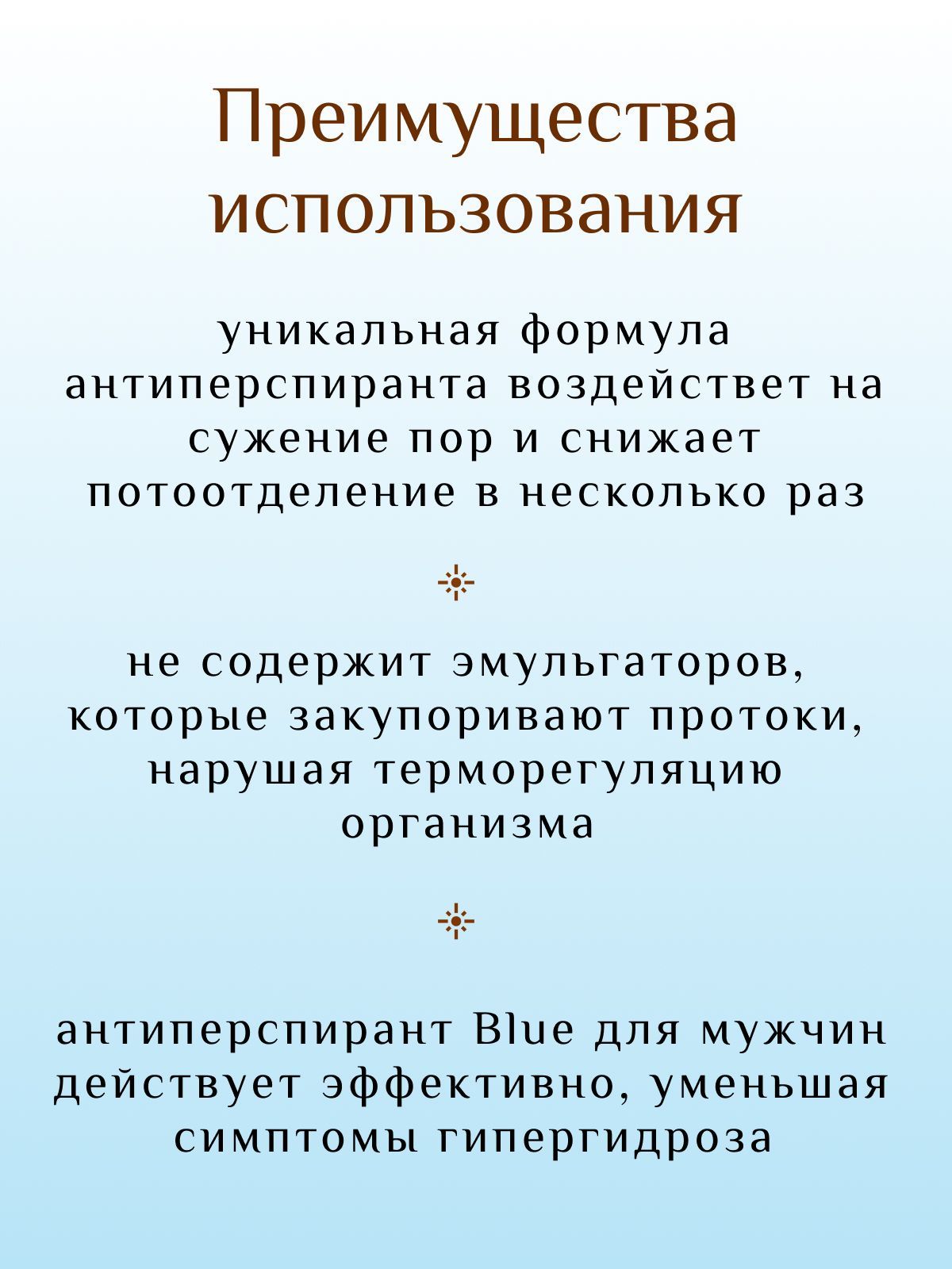 • Голубой Blue — содержит хлорид алюминия в концентрации 20%, препятствует секреции потовых желёз, уменьшает симптомы гипергидроза.