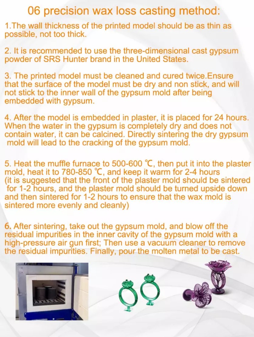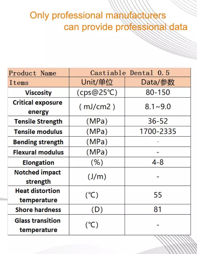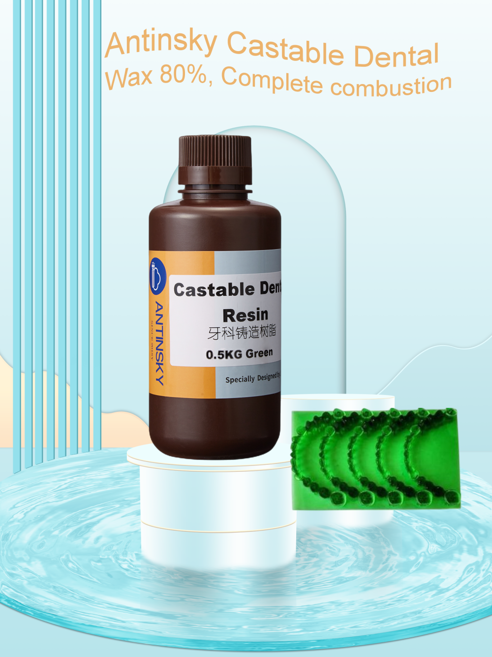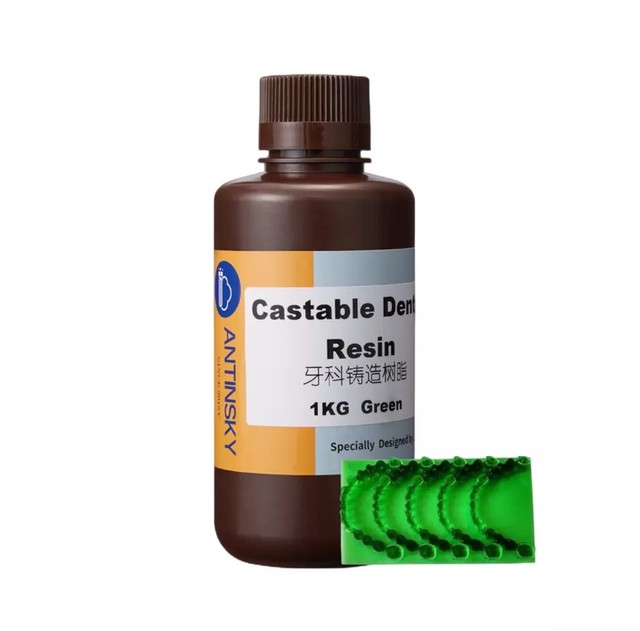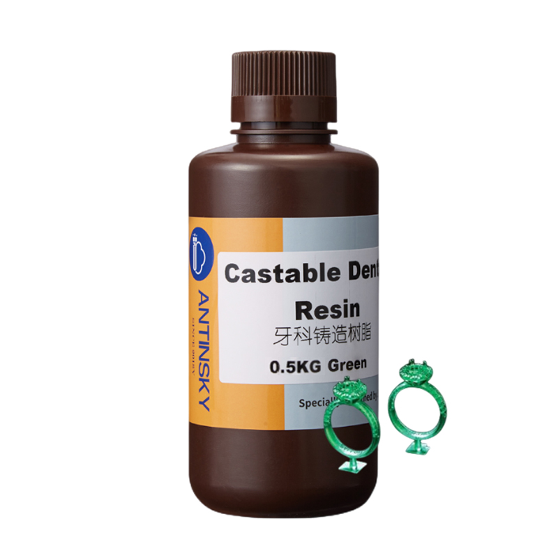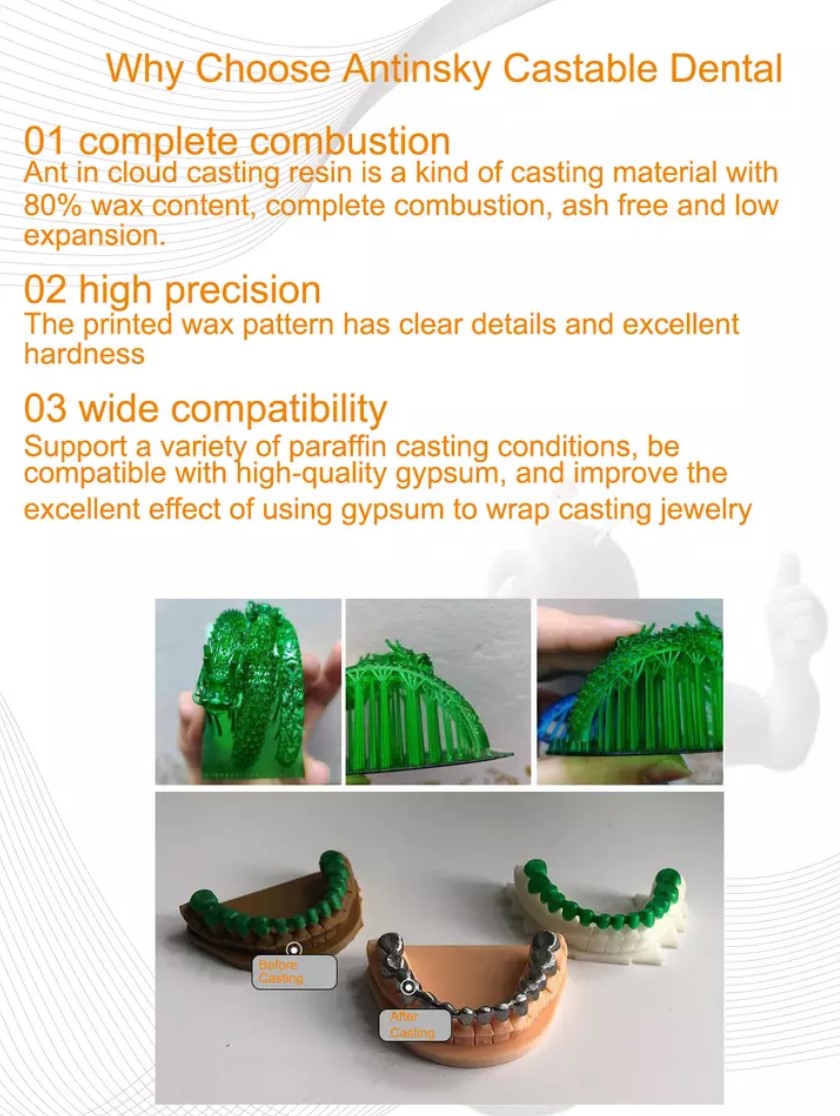 Antinsky Castiable зубные смолы 0,5 кг представляет собой зеленый материал с 80% воск, полное сгорание, нет золы и низкой усадкой. Печатный воск имеет четкие детали и отличную твердость, он поддерживает различные условия парафинового литья, совместим с высококачественным гипсом и улучшает отличный эффект использования гипса для обертывания литых ювелирных изделий.