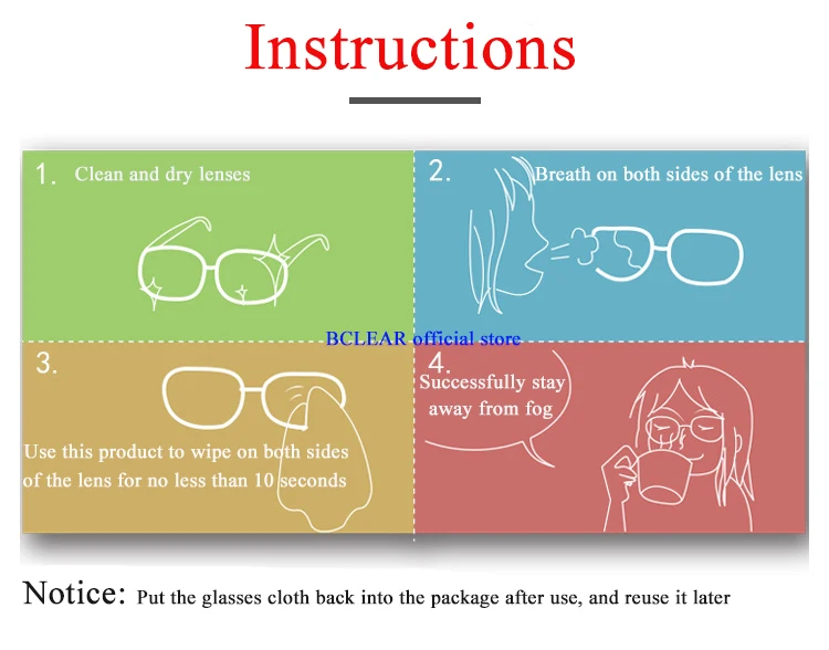 1. Противо-запотевающая салфетка для очков не допускается мыть, в противном случае она повлияет или даже исчезнет на специальные молекулы, содержащиеся в противотуманной салфетке для очков, чтобы уменьшить функцию защиты от запотевания. 2. Протрите переднюю и заднюю части несколько раз, чтобы усилить противотуманный эффект. 3. Хранить в недоступном для детей месте, после использования вымыть руки. 4. При использовании данного продукта не употреблять в пищу, не пить и не курить. 5. Чтобы продлить срок службы изделия, храните и запечатывайте его сразу после использования во избежание высвобождения.