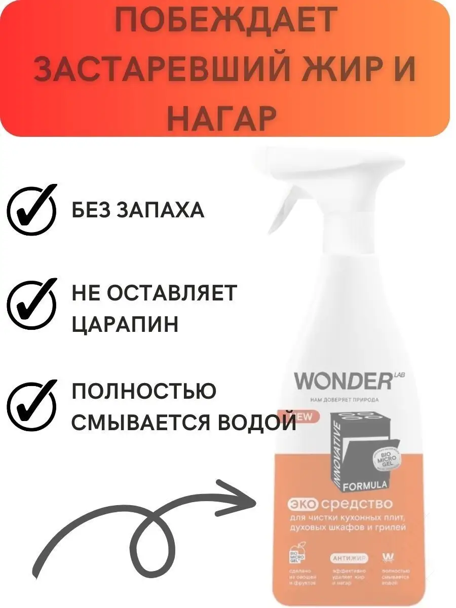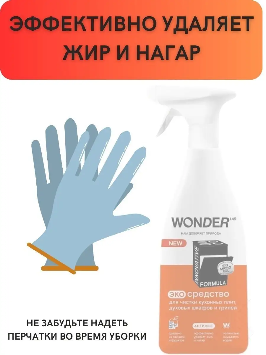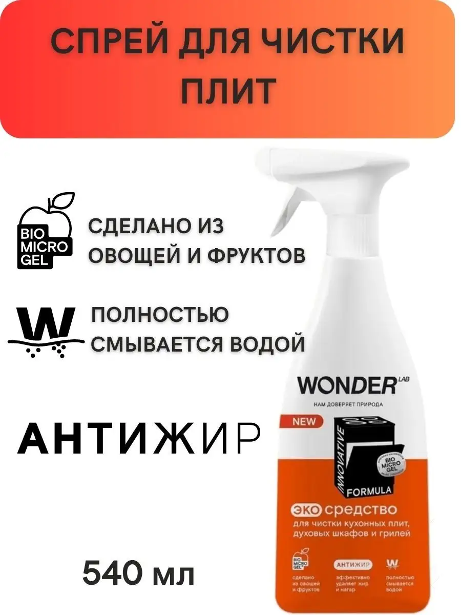 Описание: В современном мире, где мы проводим много времени на кухне, сохранение чистоты и гигиены является одним из самых важных вопросов. К сожалению, жир и нагар притягиваются как магнит на кухонные поверхности, посуду и кухонные принадлежности - это проблема, которая всегда присутствует. Но есть решение! Компания WonderLab представляет свой многофункциональный очиститель антижир для кухни, который поможет вам справиться с этой задачей легко и быстро. Жироудалитель для кухни WONDER LAB - универсальное средство, разработанное специально для кухонной плиты (индукционной, газовой, стеклокерамической), варочной панели, духового шкафа (духовки), микроволновой печи (СВЧ, микроволновки), вытяжки и мультиварки. Это чистящее и моющее средство мгновенно удаляет жир и нагар с различных поверхностей. Жидкость анти жир подходит для посуды из стеклокерамики, металла, чугуна и нержавеющей стали (гриль, казан, сковородка, кастрюля, противень, решетка, шампуры, фритюрница, барбекю). Средство для удаления жира безопасно для стекол, кафеля. Он обладает превосходными антибактериальными свойствами, что гарантирует чистоту и гигиену на вашей кухне. Антижир для кухни WonderLab обеспечивает эффективную защиту поверхностей от повторного загрязнения. Это обеспечивает длительный эффект чистоты, что позволяет вам экономить время и силы на очистке кухонных поверхностей. Спрей для уборки эффективен против застаревшего жира, налета, ржавчины, нагара и пригоревших загрязнений и масла. Средство для плиты Вандер Лаб НЕ рекомендуется использовать для мытья товаров из алюминия, окрашенных поверхностей и тефлоновых покрытий, а так же на поверхностях из искусственного камня. Жидкое средство является безопасным для природы. Оно не содержит вредных химических веществ, таких как щелочь, что делает его идеальным выбором для людей, которые заботятся о своем здоровье и окружающей среде. Эффективный экологичный спрей для чистки плиты всего за 30 секунд эффективно удаляет застарелый жир, нагар и другие виды загрязнений, а так же препятствует повторному загрязнению. Инструкция по способу применения средства wander lab: наденьте резиновые перчатки, распылите очиститель жира на загрязнённую поверхность, для сильных загрязнений подождите 5 - 10 минут (НЕ используйте средство на алюминиевых, антипригарных и тефлоновых поверхностях! С осторожностью используйте на окрашенных поверхностях). Удалите пену с загрязнением, смойте водой. Протрите насухо губкой и тряпкой. Спрей полностью смывается водой, не оставляя плёнок, царапин и разводов. Умный состав средства для уборки безопасен для человека, природы и септиков. Инновационная формула WonderLab не нарушает экосистему водоемов, так как средство анти жир для кухни не содержит синтетических, агрессивных компонентов. Мы любим природу и заботимся об окружающей среде, вондерлаб не поддерживает тестирование на животных, а уникальная формула BIOMICROGEL разлагается в природе на 98% за 1 день. Упаковка наших продуктов производится из многоразового материала, поэтому сдайте флакон на переработку в пунктах приема пластика. Бытовая химия для уборки дома безопасна для септиков! Средства мы делаем из овощей и фруктов. Средство без фосфатов и фосфонатов. Антижир для кухни от WonderLab поставляется в бутылочке объемом 550 мл, что достаточно для длительного исп