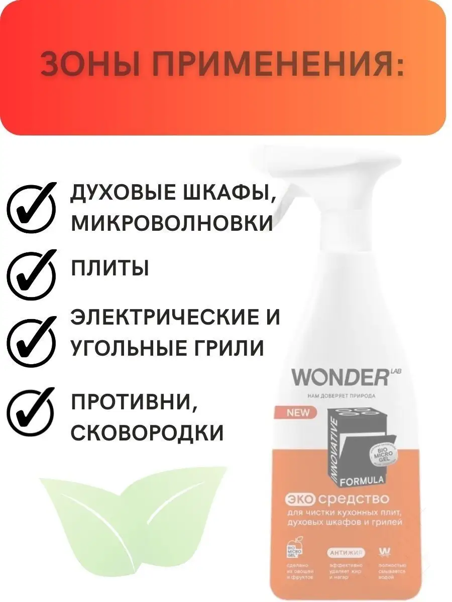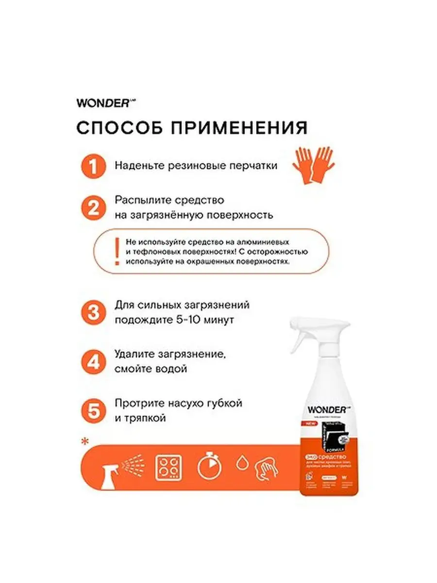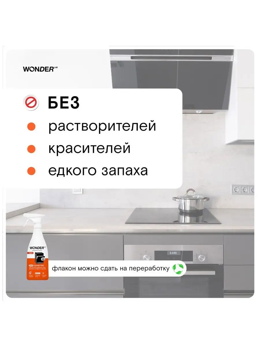Описание: В современном мире, где мы проводим много времени на кухне, сохранение чистоты и гигиены является одним из самых важных вопросов. К сожалению, жир и нагар притягиваются как магнит на кухонные поверхности, посуду и кухонные принадлежности - это проблема, которая всегда присутствует. Но есть решение! Компания WonderLab представляет свой многофункциональный очиститель антижир для кухни, который поможет вам справиться с этой задачей легко и быстро. Жироудалитель для кухни WONDER LAB - универсальное средство, разработанное специально для кухонной плиты (индукционной, газовой, стеклокерамической), варочной панели, духового шкафа (духовки), микроволновой печи (СВЧ, микроволновки), вытяжки и мультиварки. Это чистящее и моющее средство мгновенно удаляет жир и нагар с различных поверхностей. Жидкость анти жир подходит для посуды из стеклокерамики, металла, чугуна и нержавеющей стали (гриль, казан, сковородка, кастрюля, противень, решетка, шампуры, фритюрница, барбекю). Средство для удаления жира безопасно для стекол, кафеля. Он обладает превосходными антибактериальными свойствами, что гарантирует чистоту и гигиену на вашей кухне. Антижир для кухни WonderLab обеспечивает эффективную защиту поверхностей от повторного загрязнения. Это обеспечивает длительный эффект чистоты, что позволяет вам экономить время и силы на очистке кухонных поверхностей. Спрей для уборки эффективен против застаревшего жира, налета, ржавчины, нагара и пригоревших загрязнений и масла. Средство для плиты Вандер Лаб НЕ рекомендуется использовать для мытья товаров из алюминия, окрашенных поверхностей и тефлоновых покрытий, а так же на поверхностях из искусственного камня. Жидкое средство является безопасным для природы. Оно не содержит вредных химических веществ, таких как щелочь, что делает его идеальным выбором для людей, которые заботятся о своем здоровье и окружающей среде. Эффективный экологичный спрей для чистки плиты всего за 30 секунд эффективно удаляет застарелый жир, нагар и другие виды загрязнений, а так же препятствует повторному загрязнению. Инструкция по способу применения средства wander lab: наденьте резиновые перчатки, распылите очиститель жира на загрязнённую поверхность, для сильных загрязнений подождите 5 - 10 минут (НЕ используйте средство на алюминиевых, антипригарных и тефлоновых поверхностях! С осторожностью используйте на окрашенных поверхностях). Удалите пену с загрязнением, смойте водой. Протрите насухо губкой и тряпкой. Спрей полностью смывается водой, не оставляя плёнок, царапин и разводов. Умный состав средства для уборки безопасен для человека, природы и септиков. Инновационная формула WonderLab не нарушает экосистему водоемов, так как средство анти жир для кухни не содержит синтетических, агрессивных компонентов. Мы любим природу и заботимся об окружающей среде, вондерлаб не поддерживает тестирование на животных, а уникальная формула BIOMICROGEL разлагается в природе на 98% за 1 день. Упаковка наших продуктов производится из многоразового материала, поэтому сдайте флакон на переработку в пунктах приема пластика. Бытовая химия для уборки дома безопасна для септиков! Средства мы делаем из овощей и фруктов. Средство без фосфатов и фосфонатов. Антижир для кухни от WonderLab поставляется в бутылочке объемом 550 мл, что достаточно для длительного исп