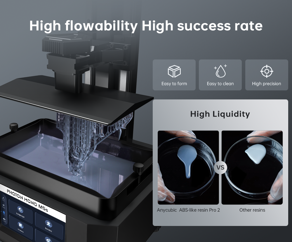 Низкая вязкость и высокая текучесть сокращают время отверждения и упрощают формование моделей. Смола обеспечивает быстрый оплавление, уменьшая расслоение при печати модели. В то же время адгезия объединительной платы лучше, что эффективно снижает риск сбоя печати.