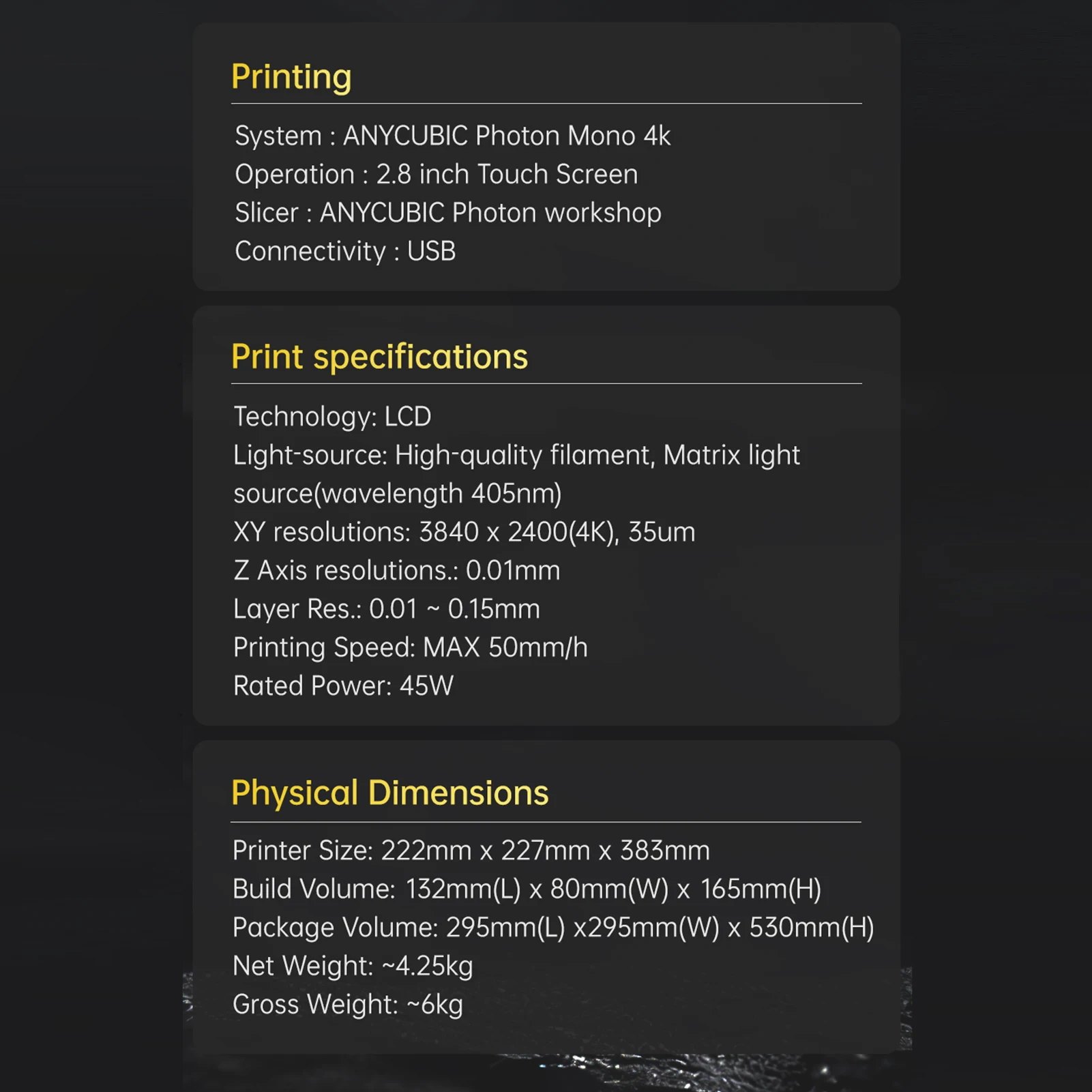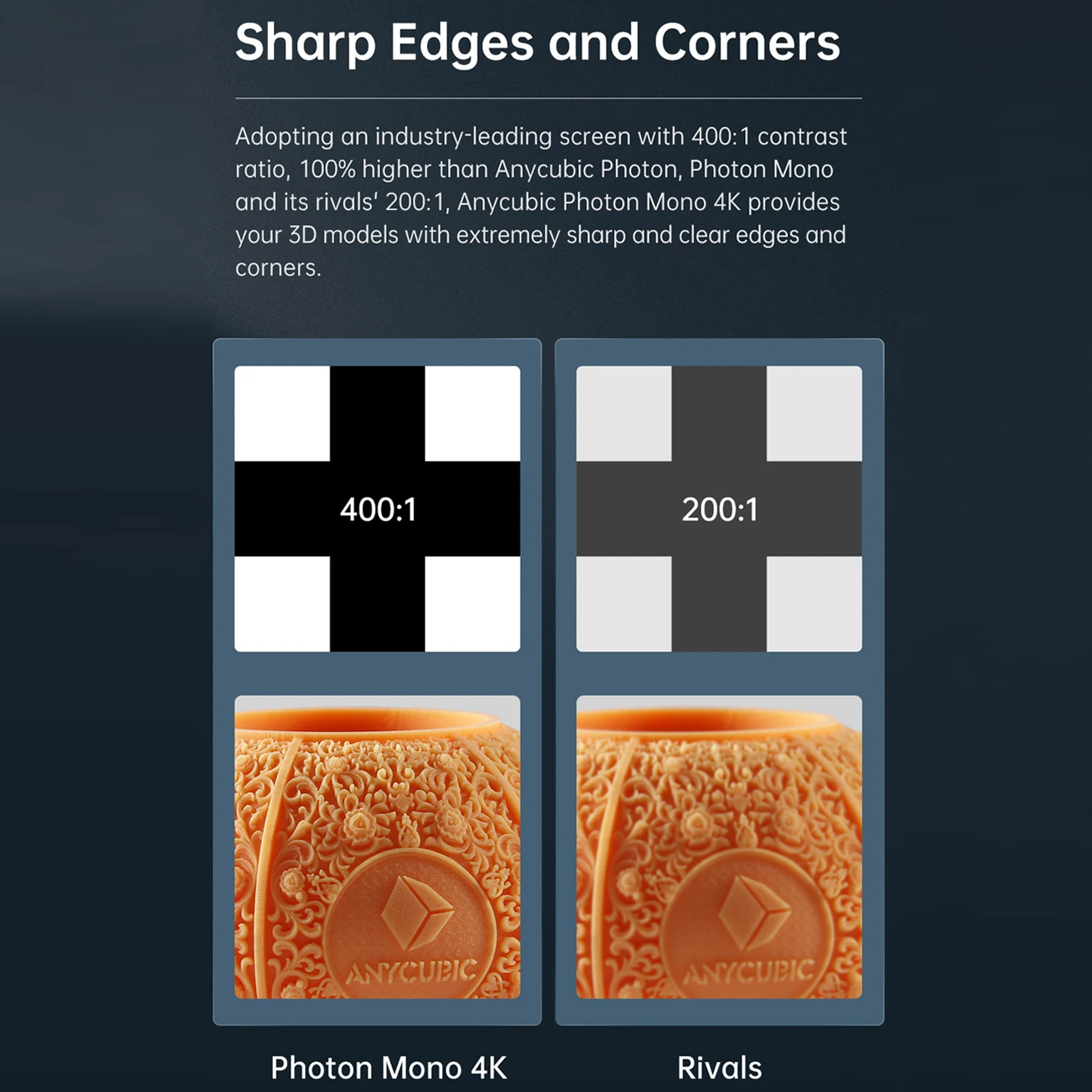 4K Высокое разрешение: монохромный ЖК-экран 4K имеет разрешение HD 3840x2400, 35um X Y пикселей и коэффициент пропускания 7% светильник, это означает, что вы можете напечатать все ваши модели на более высоком уровне точности. Кроме того, коэффициент контрастности составляет более 350, что делает детали печати более точными и деликатными, тем самым улучшая качество печати и уровень успеха