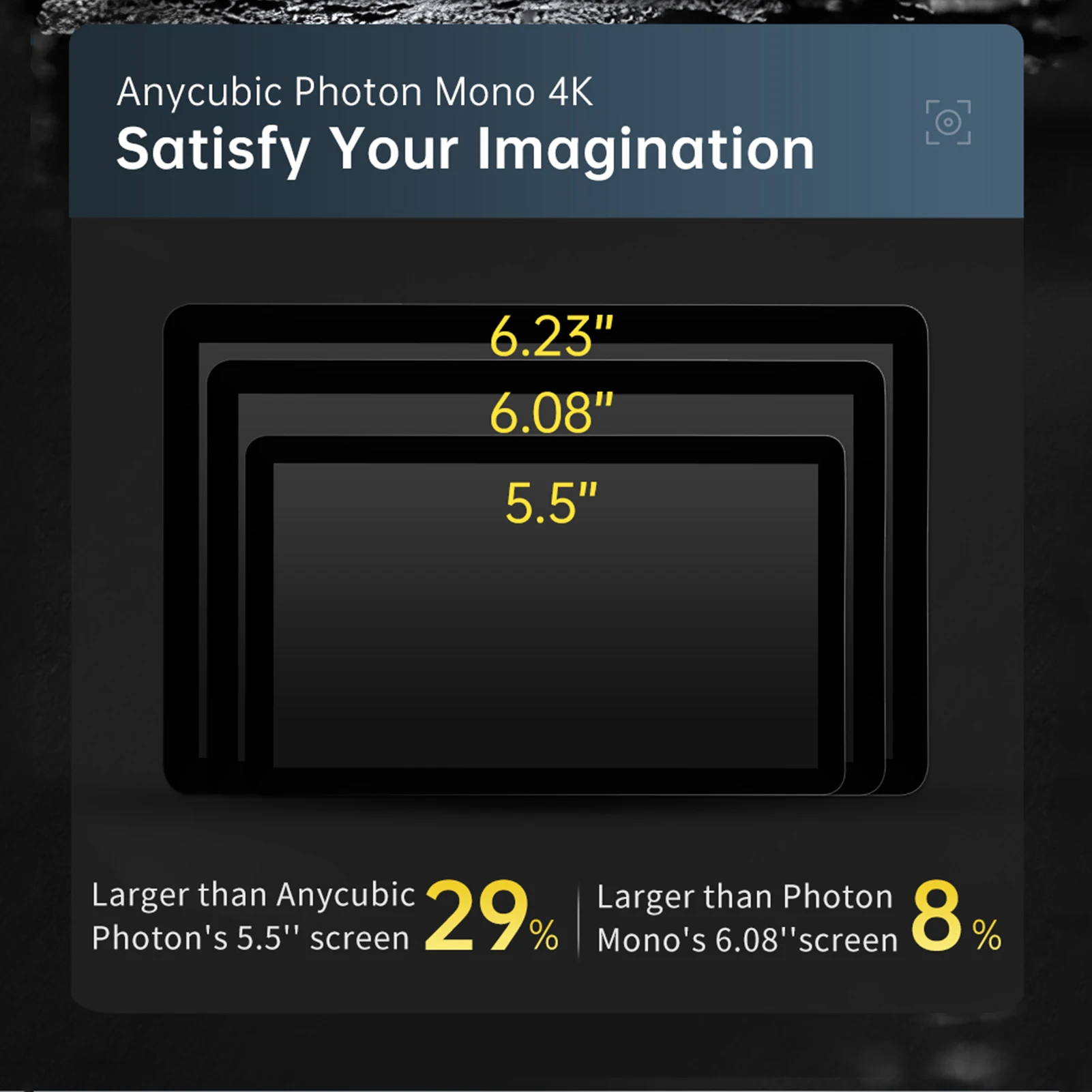 6,23 "большой экран: Фотон моно 4K Смолы 3D принтер обновлен до 6,23" Монохромный ЖК-экран, на 29% больше, чем экран 5,5 "ANYCUBIC Photon. Быстрое прототипирование значительно повышает эффективность печати путем печати одного слоя в 1.5S. ЖК-экран более прочный, на 4 раза дольше срока службы, чем экран RGB.