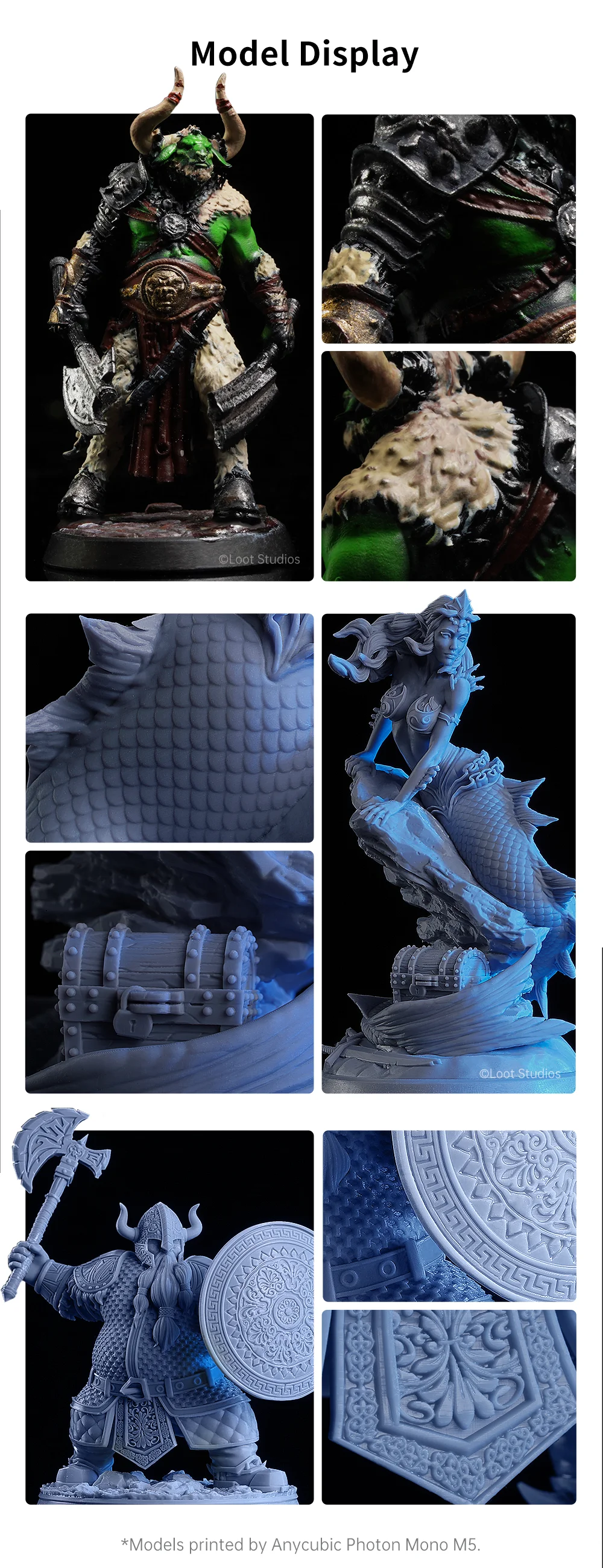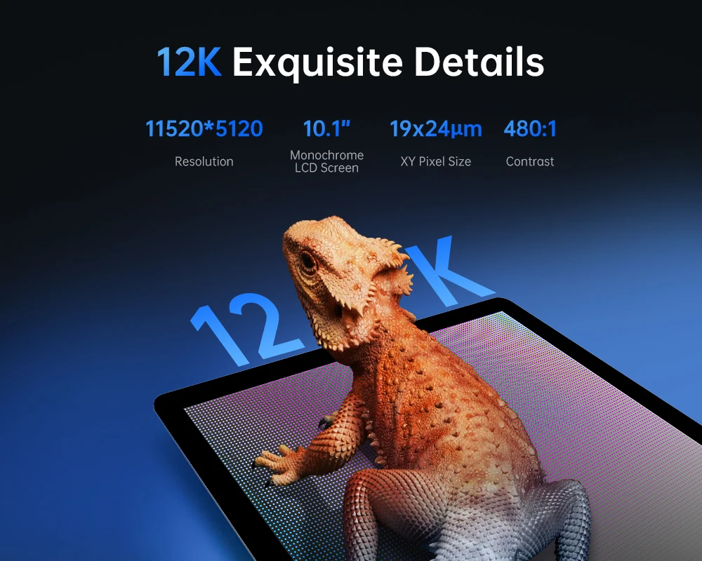 Photon Mono M5-первый монохромный ЖК-экран с диагональю 10,1 дюйма с разрешением 11520*5120, с горизонтальным размером пикселя 19 мкм, которые могут предложить детали печатания как точные как толщина волос. Коэффициент контрастности составляет 480:1, что делает края модели четкими и четко определенными.