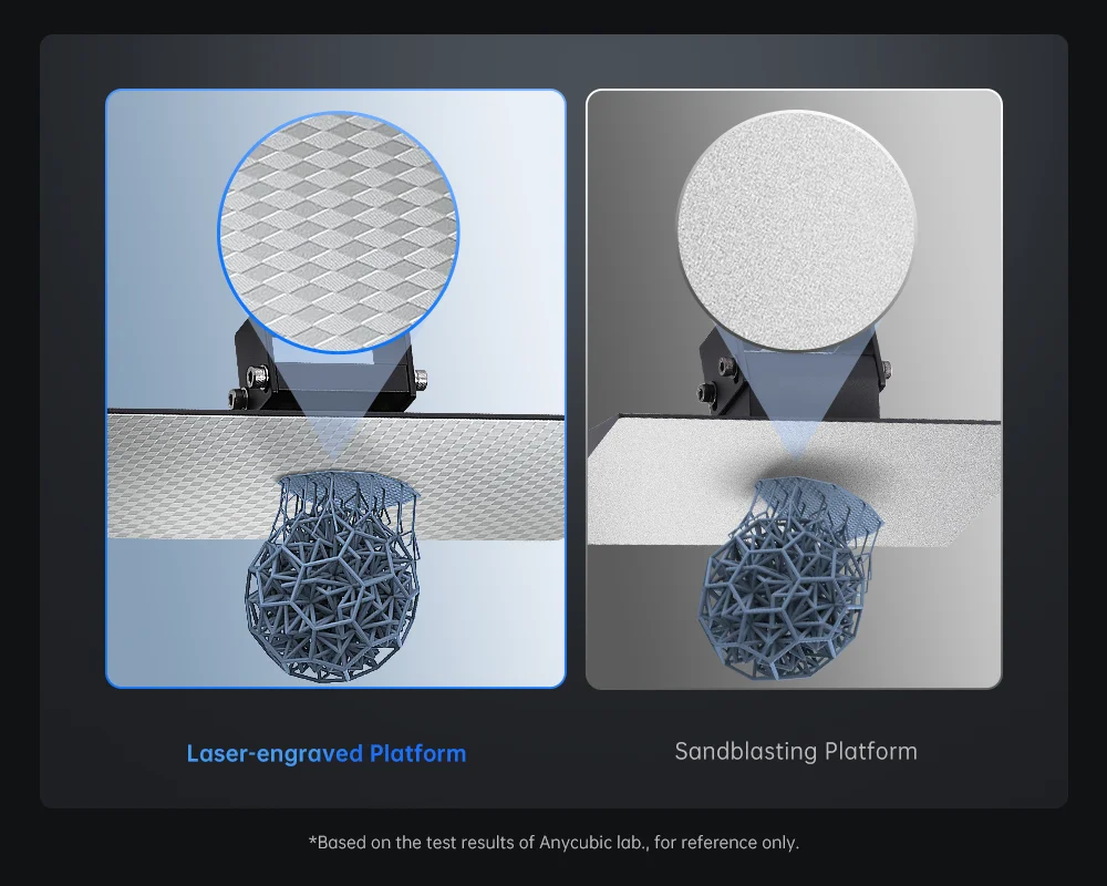 Использование процесса лазерной гравировки для печатной платформы позволяет сборочной пластине иметь лучшую плоскостность, чем пескоструйные платформы, что может эффективно улучшить адгезию модели, уменьшить ситуацию падения и деформации модели печати и значительно повысить вероятность успеха печати.