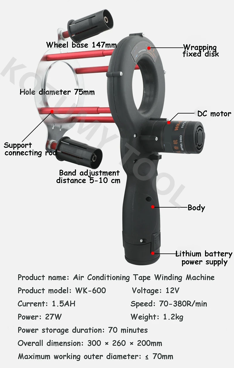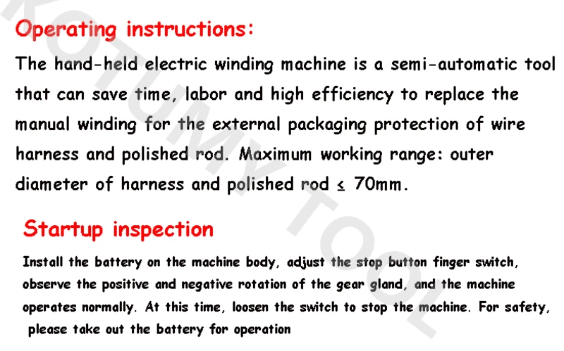 Ручная электрическая обмоточная машина-это полуавтоматический инструмент, который может сэкономить время, трудолюбие и высокую эффективность, чтобы заменить ручную обмотку для защиты внешней упаковки проводов и полированного стержня. Максимальный рабочий диапазон: внешний диаметр жгута и полированный rod≤ 70 мм.
