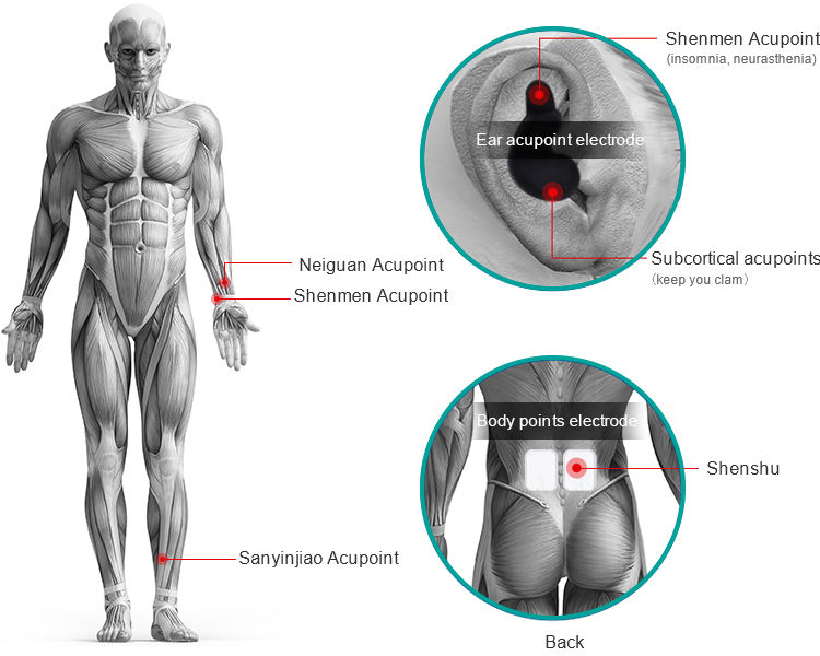 Микротоковый Меридиан стимулирует четыре акупунктурные точки: Neiguan, Shenmen, Sanyinjiao, Shenshu. Искрешение нормальной координации между сердцем и почками, создание факторов сна для лечения бессонницы.