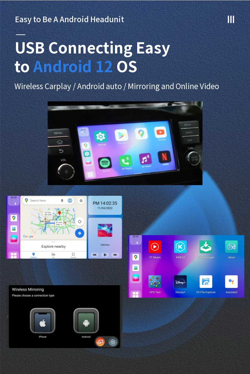⚪Через интерфейс OEM CarPlay USB OTG в автомобиле и зеркальное отображение всей системы Android на экран OEM.