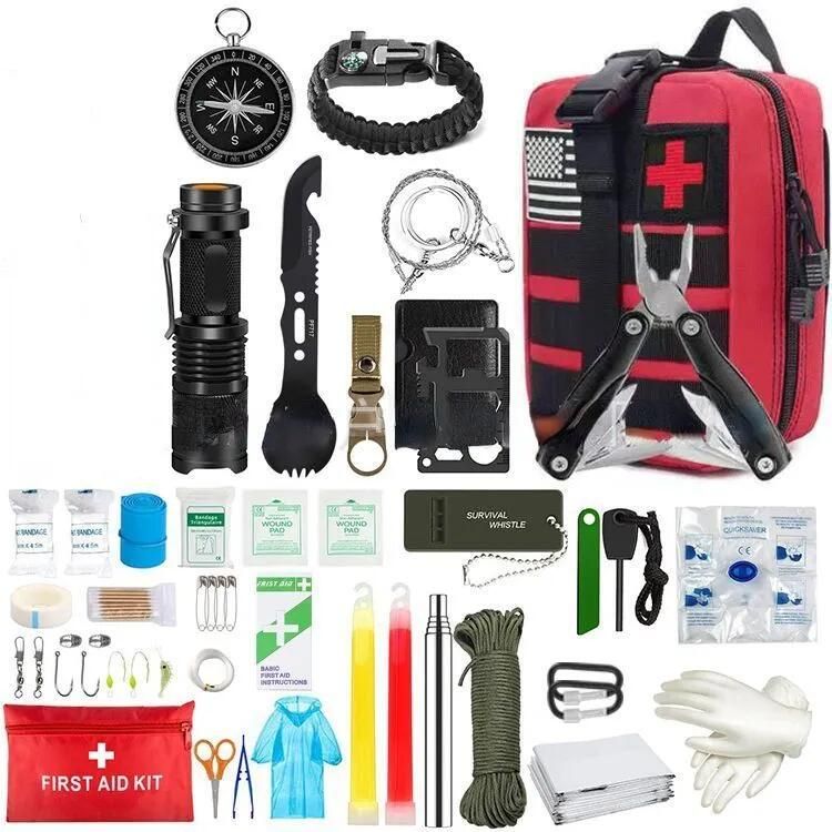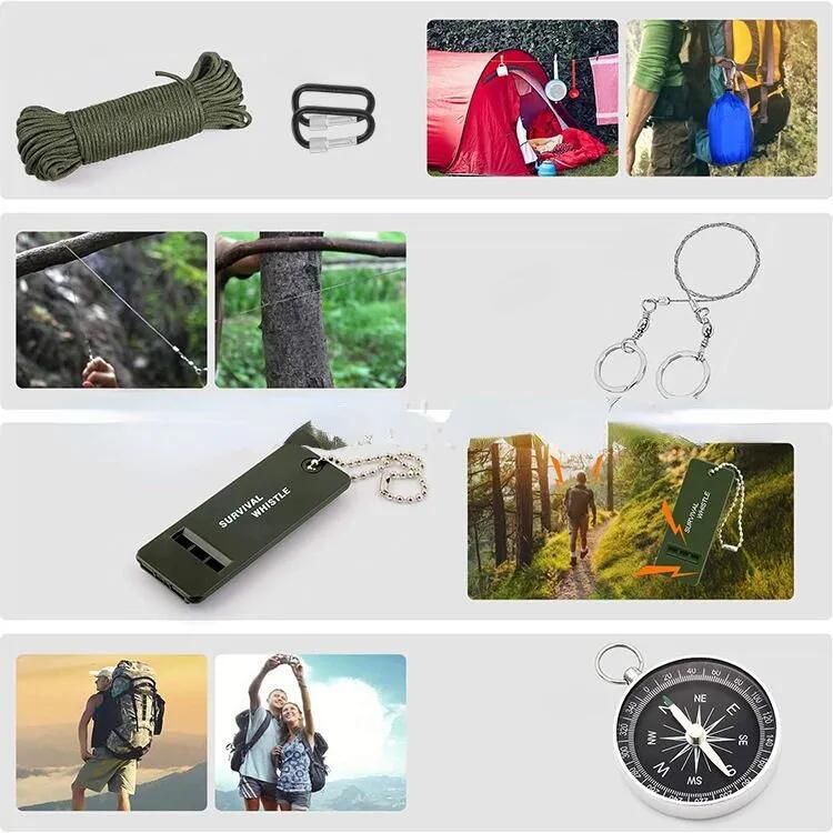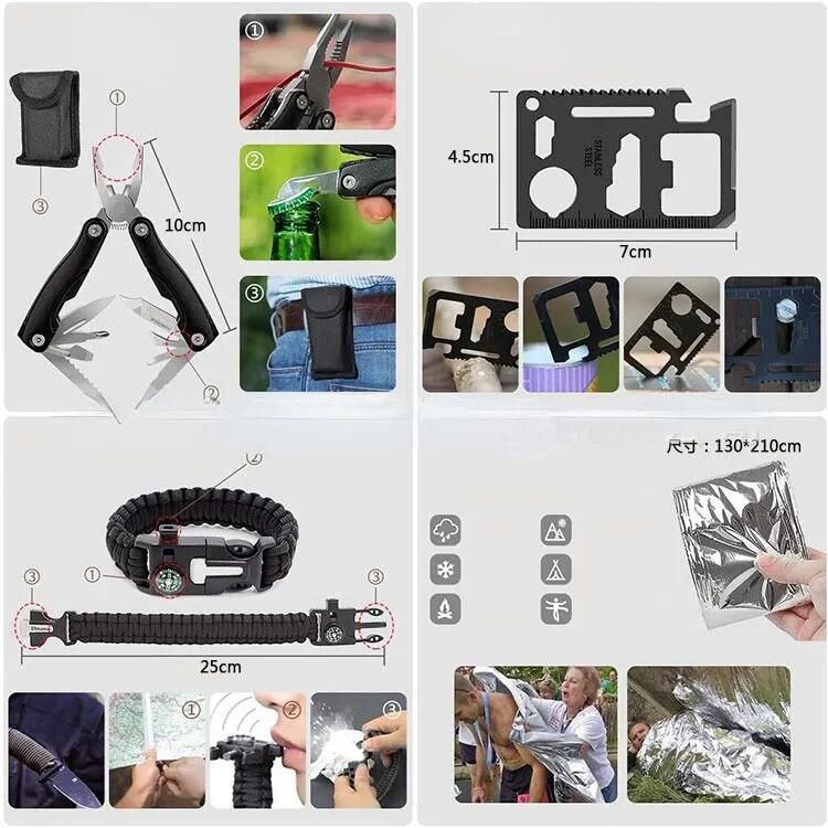 Тактический нож * 1; Мощный фонарик * 1; Складные плоскогубцы * 1; Нож со свистком * 1; Пряжка для бутылки с водой * 1; Веревка для зонта * 1; Светящаяся палочка * 1; * 1; Кремень * 1; Свисток для выживания * 1; Выживание Браслет * 1 Перчатки из ПВХ * 1 Дождевик * 1 Компас * 1 Маска первой помощи * 1 Одеяло первой помощи * 1