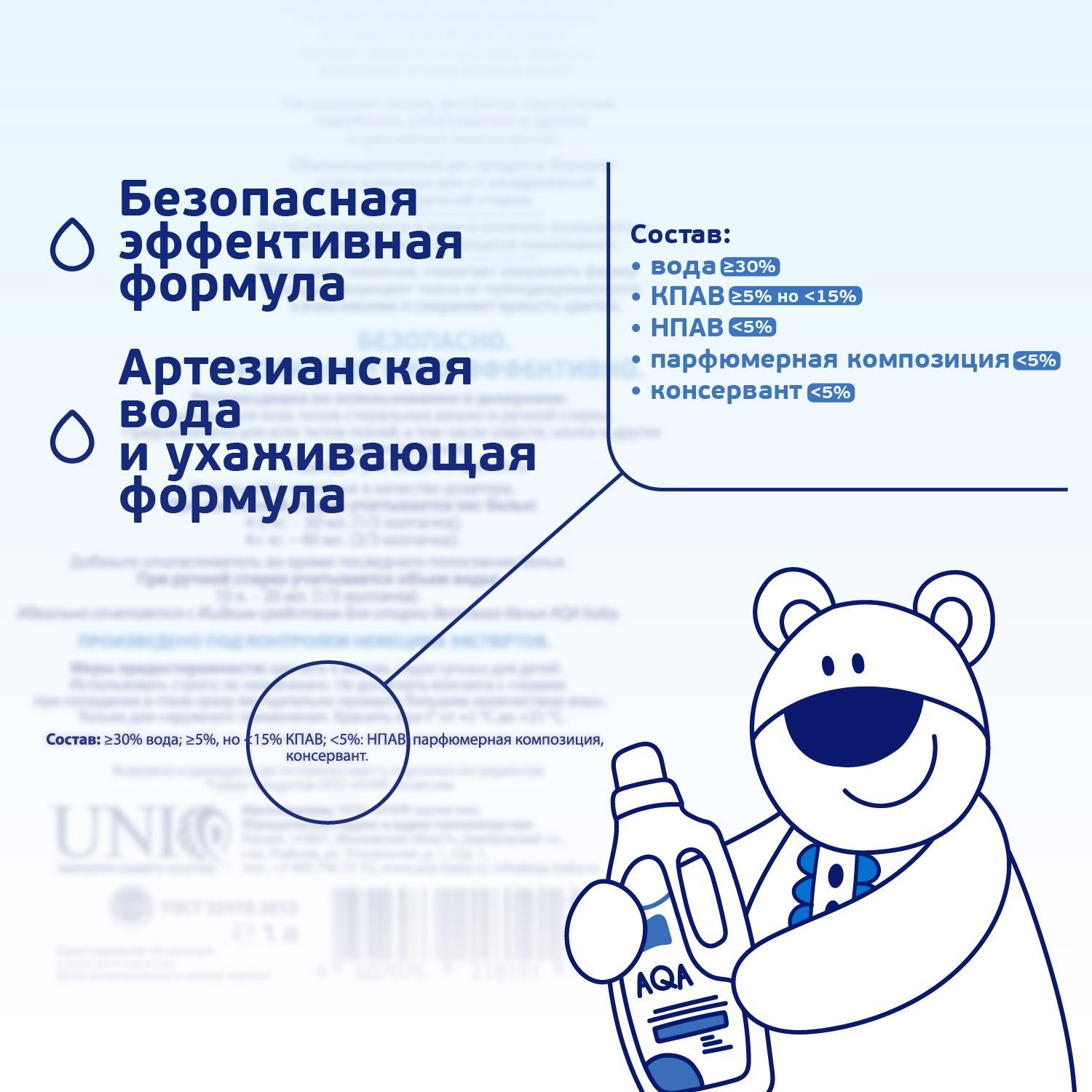 Описание: Разработано специально для детского белья - с первых дней жизни. Легко растворяется при стирке и отлично вымывается из волокон ткани в процессе полоскания. Не содержат фосфатов, хлора, красителей и других химических агрессивных компонентов. Отстирывает молочные пятна, жир, загрязнения растительного происхождения. Сбалансированный рН продукта не снижает отстирывающую способность, но и не портит кожу рук. Подходит для белого и цветного белья. Идеально сочетается с ополаскивателем для детского белья AQA baby.