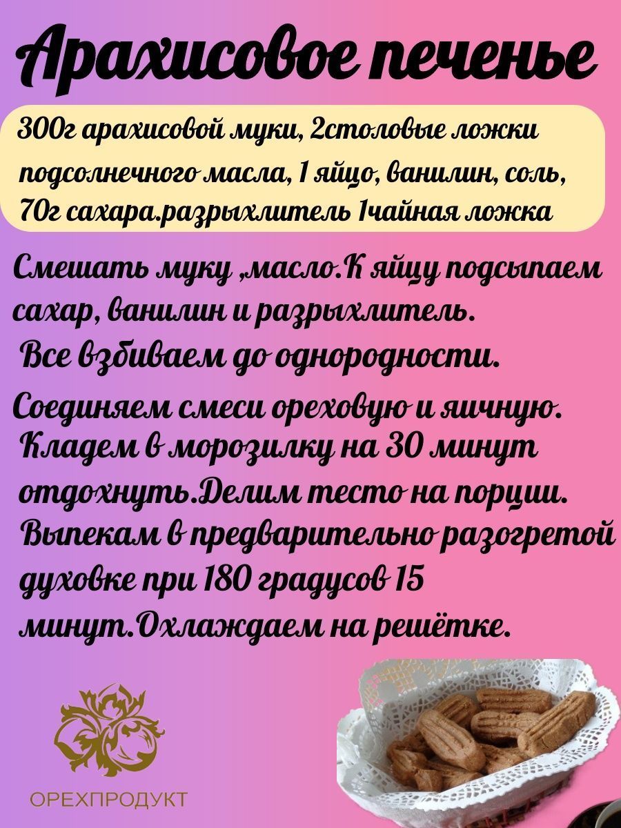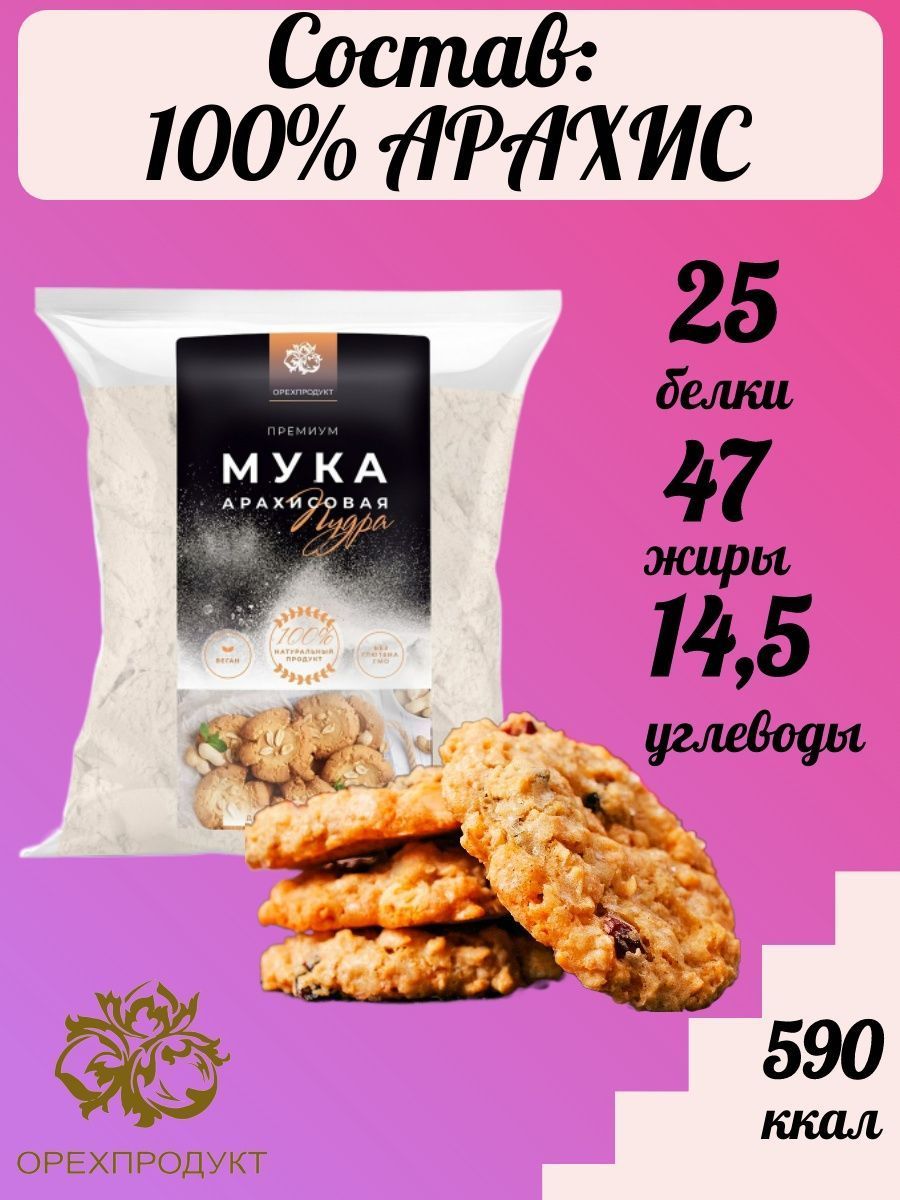 Описание: Арахисовая мука представляет собой частично обезжиренный, высушенный и смолотый арахис. В результате она имеет гораздо более низкую жирность и калорийность по сравнению с исходным продуктом. Мука является прекрасной безглютеновой альтернативой традиционной пшеничной муке. Ее часто используют в кулинарии для повышения вкуса различных блюд, а также при соблюдении низкоуглеводной диеты. Арахисовую муку применяют при приготовлении различных соусов, супов, макарунс,хлеба, пирожных и лапши, а также протеиновых коктейлей и батончиков. Повара и кондитеры используют арахисовую муку для загущения супов и соусов, а также добавляют ее в различные гарниры и десерты для улучшения их вкуса. Иногда они частично или полностью заменяют ею пшеничную муку, используемую при приготовлении кондитерских изделий. Арахисовая мука полностью растительный продукт богатый белком, так необходимым для правильного, веганского, вегетарианского и спортивного питания, для белковой диеты.