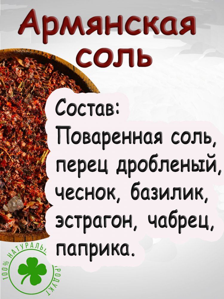 Армянская соль - это сухая смесь специй и соли, традиционно используемая в кавказской кухне. Великолепная, пряно-острая соль. Используется для приготовления мясных блюд, для приготовления супов, соусов, овощных салатов, маринадов. Армянская соль Добавляется по вкусу в любое блюдо! Смесь является универсальной!