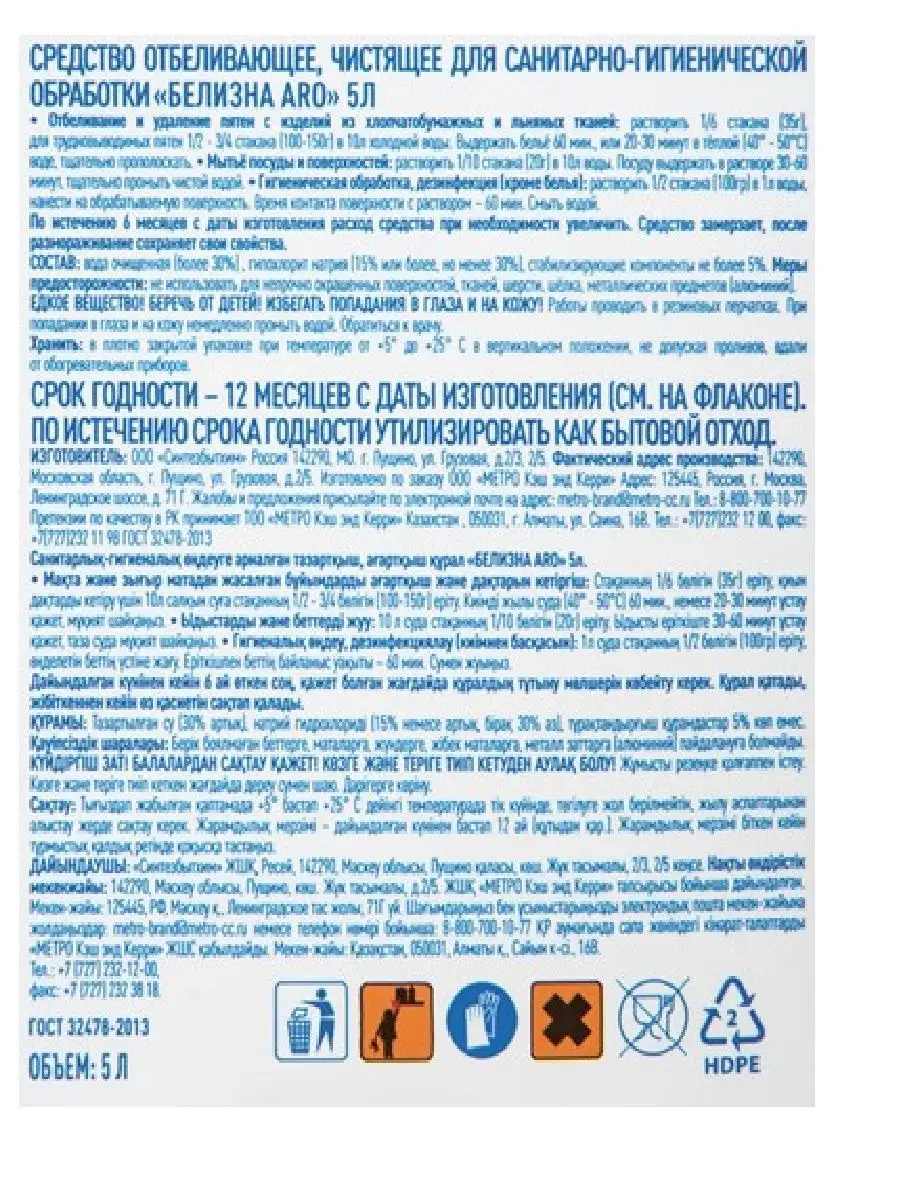 Описание: Aro Белизна, 5л, 1шт. Состав: 30% и более вода, 5% или более, но менее 15% гипохлорит натрия. Отбеливатель разводится только в холодной воде, рекомендуется пользоваться маской и резиновыми перчатками. Не подходит для цветных и деликатных тканей.