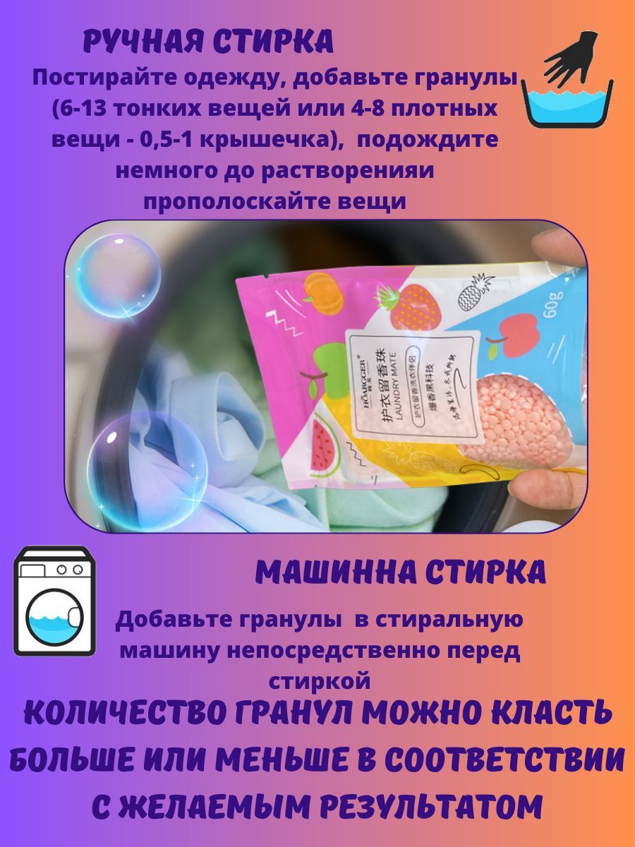 Описание: Парфюм для стирки - это ароматические гранулы, которые придают аромат белью, способствуют разглаживанию одежды, делая ее мягкой после стирки. Одежда приобретает аромат духов, который сохраняется на протяжении долгого времени. Гранулы используются не вместо порошка, а в дополнении к нему. Гранулированные варианты хорошо подойдут для белья и другой одежды. Благодаря спрессованной гранулированной структуре для стирки нужно использовать небольшое количество состава. Данный товар имеет приятный аромат, что позволяет не только улучшить ткань тактильно, но и придать ей аромат и свежесть, которые не всегда удается получить при помощи других средств. Выбор гранулированного кондиционера будет удобен тем, кто не хочет использовать большие емкости с гелями, но предпочитает носить мягкую и ароматную одежду. При правильном использовании получится защитить и сохранить белье и другие вещи на долгий срок. Представленные гранулированные продукты обладают хорошей растворимостью в воде при комнатной температуре. Как использовать? Перед стиркой одежды Вы можете выбрать свои любимые ароматические бусины и бросить их непосредственно в стиральную машину, затем добавить одежду, добавить шарики для стирки или жидкое моющее средство и включить обычный режим стирки. Гранулы легко растворяются даже в холодной воде, подходят для всех видов и цветов тканей. Биоразлагаемый состав, не содержит фосфатов, хлора и формальдегида, гипоаллергенно. Хранить при комнатной температуре, в недоступном для детей месте.