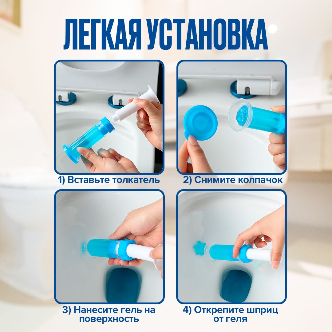 ПРОСТОЕ ПРИМЕНЕНИЕ. Установите толкатель в шприц. Снимите с дозатора защитный колпачок. А затем легким надавливанием нанесите гель на поверхность унитаза. Отсоедините шприц от геля, на поверхности унитаза появится диск очистителя.