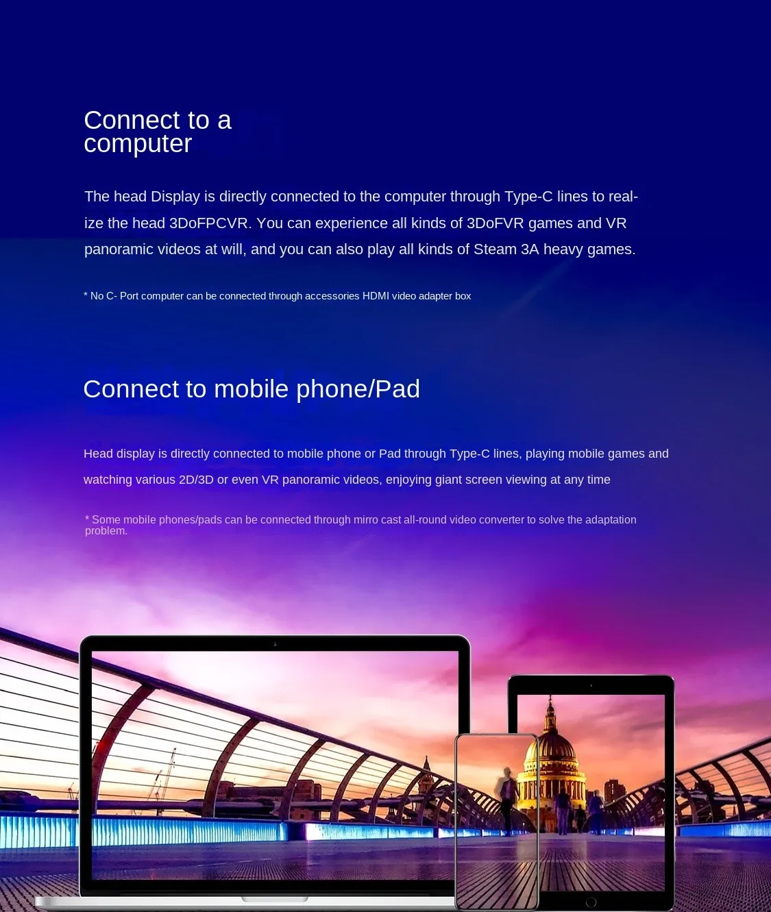 6. VR Мобильный просмотр: гарнитура напрямую подключается к мобильный телефон или прокладке через кабель Type-C, И Мобильная платформа управления вещанием arparahome может не только реализовать свободу 3DoF головы, чтобы играть в VR игры, но и смотреть различные 2D/3D видео, И наслаждайтесь просмотром экрана 5K в любое время