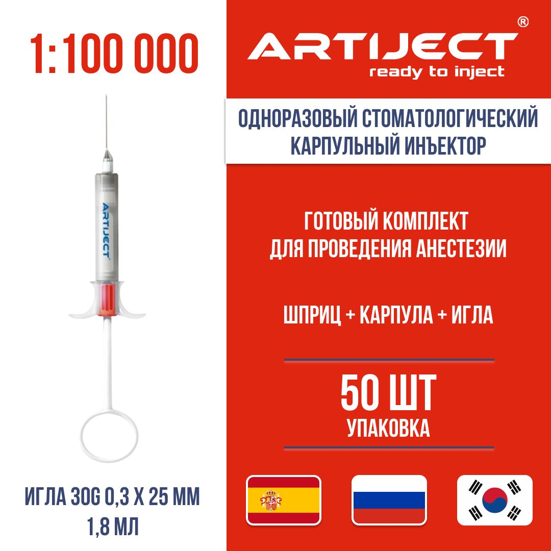 Состав комплекта: одноразовый стоматологический карпульный инъектор ARTIJECT + игла стоматологическая одноразовая 0,3-25мм + карпула 1,8 мл с 4% раствором Артикаина Inibsa  с содержанием эпинефрина 1:100000.