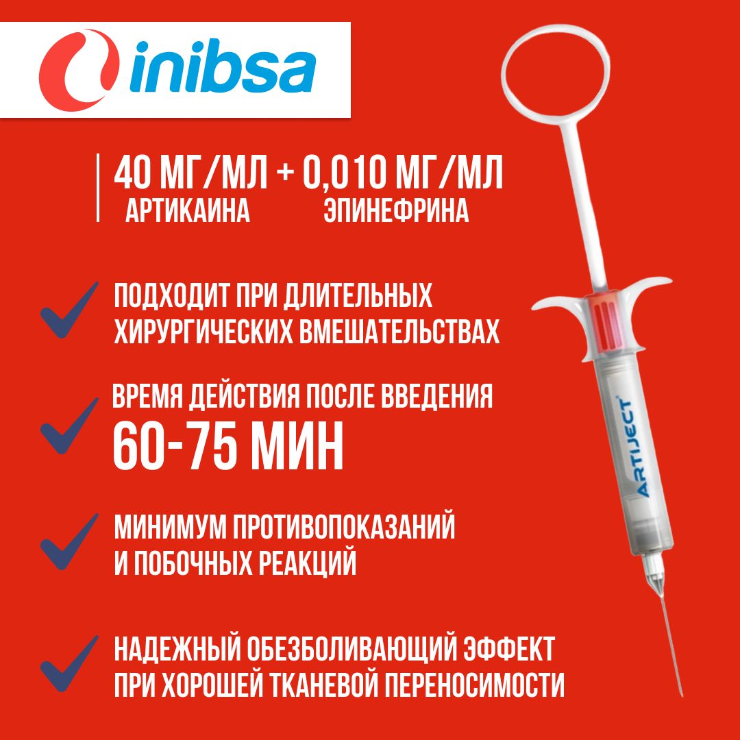 Одноразовый стоматологический карпульный инъектор ARTIJECT с Артикаином Инибса (INIBSA) 1:100000 - с сосудосуживающим эффектом, комбинированный (артикаин 4% с эпинефрином 1:100 000). Предназначен для проведения инфильтрационной, проводниковой, интралигаментарной, интрасептальной и внутрипульпарной анестезии врачом-стоматологом. Обладает высокой эффективностью и малой токсичностью по сравнению с другими анестетиками.