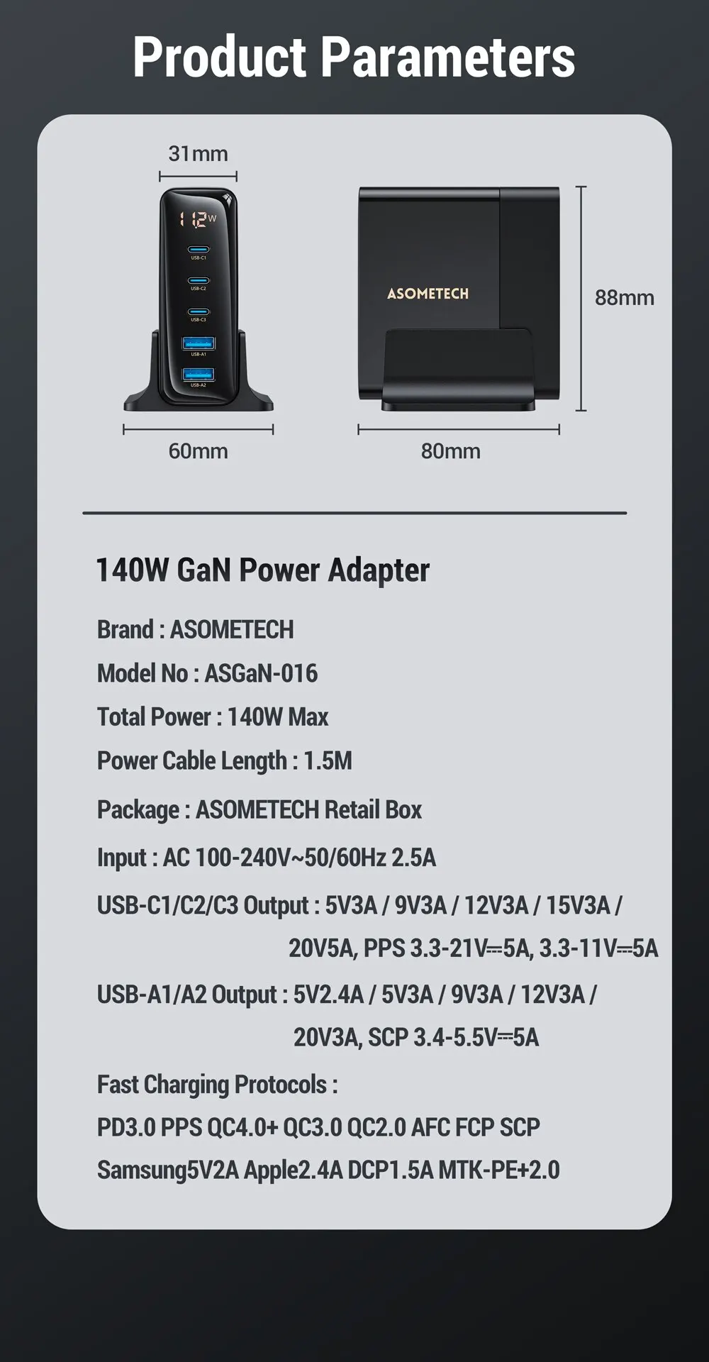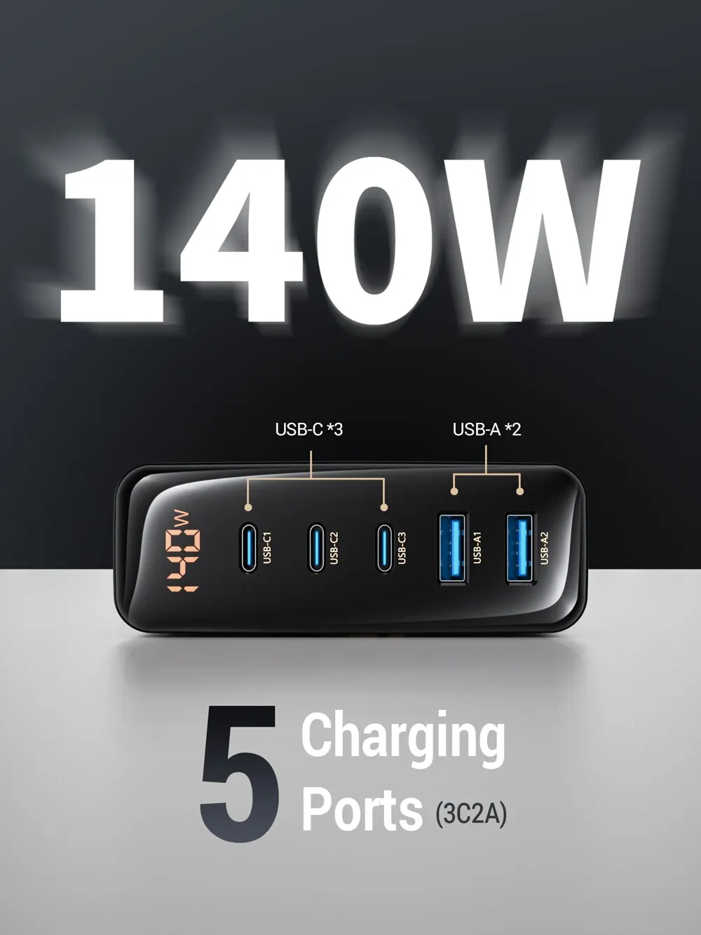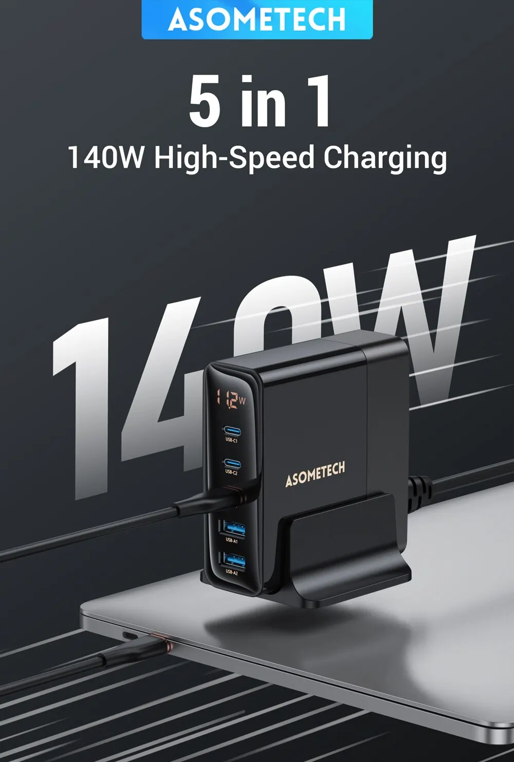 Зарядное устройство ASOMETECH 140 Вт GaN, настольная зарядная станция USB, 5 портов USB, PD 100 Вт PPS AFC FCP SCP QC4.0 QC3.0 USB быстрое зарядное устройство для MacBook iPhone 14 13 12 Pro Samsung S22 Samsung Tab S8 Huawei Xiaomi