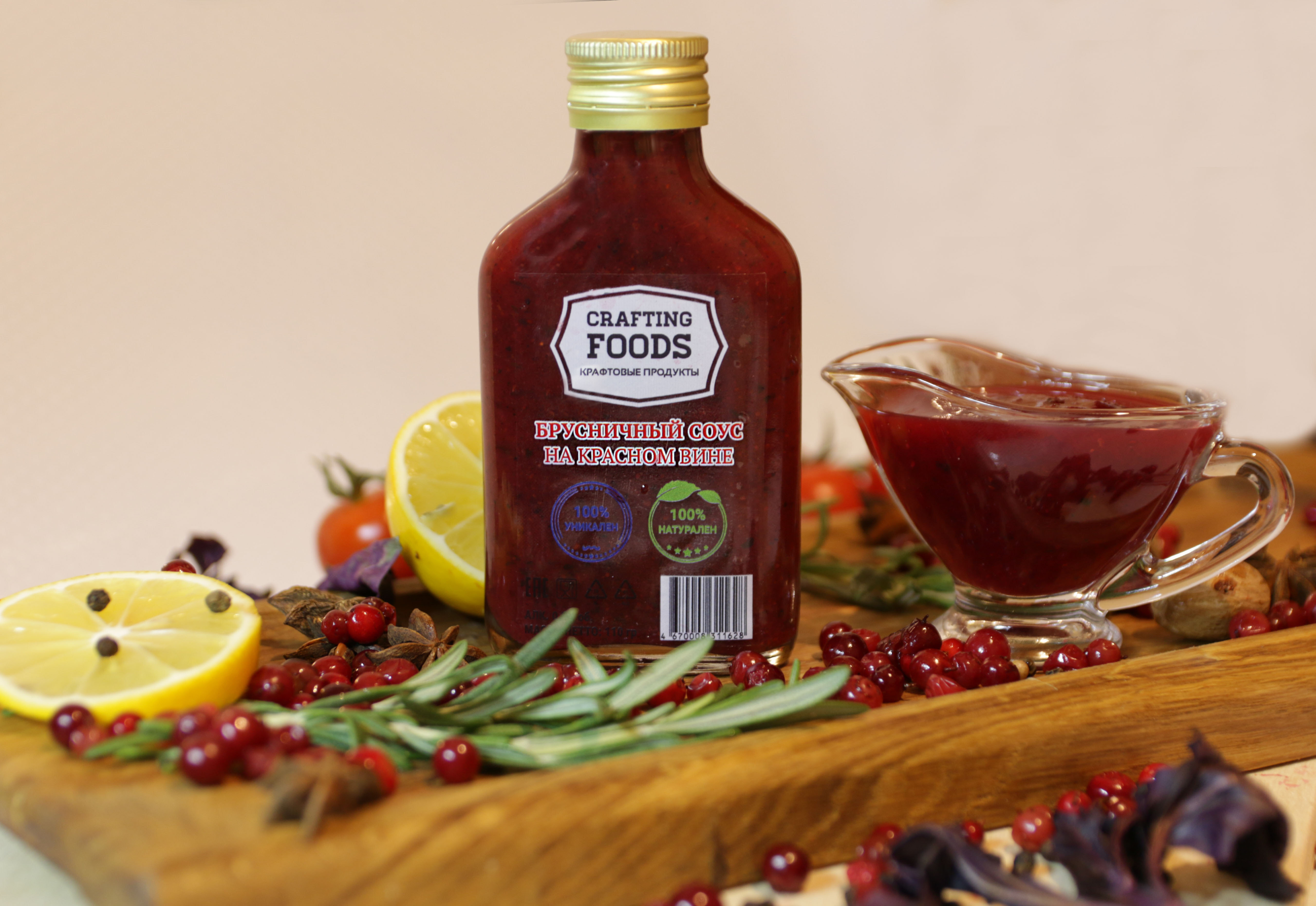 Клюквенный соус - клюква, вода, сахар, яблоки, коньяк (дистилляты коньячные, вода питьевая, сахарный сироп, сахарный колер), лимонный сок, соль, корица, мускатный орех, гвоздика, цедра апельсина. Брусничный соус - брусника, вода, сахар, яблоки, сухое красное вино, лимонный сок, соль, корица, мускатный орех, гвоздика, базилик. Абрикосовый соус - абрикосы, вода, сахар, лимонный сок, чеснок, перец чили, петрушка, базилик