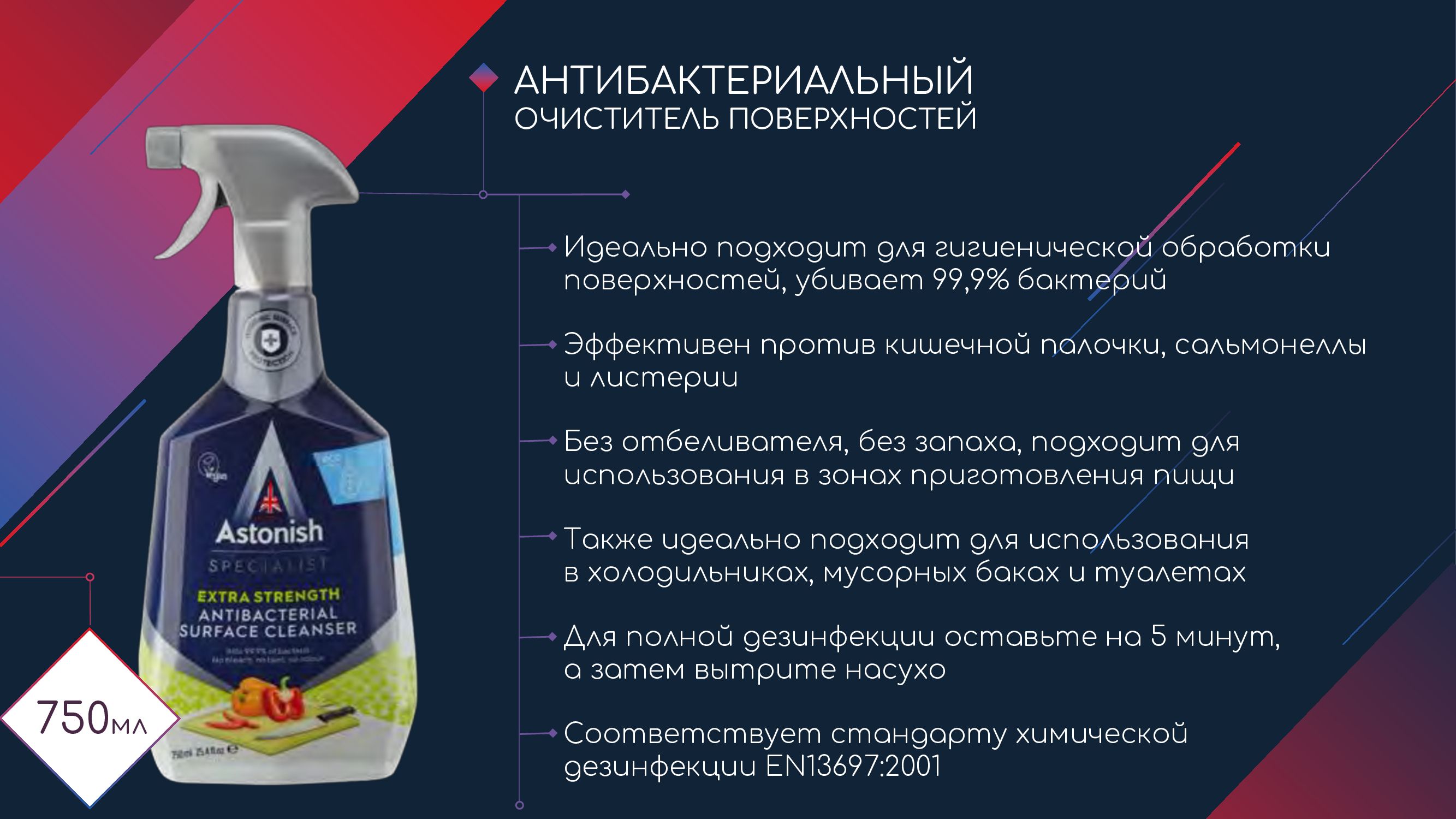 Описание: Универсальное чистящее средство для различных поверхностей с антибактериальным эффектом Astonish убивает 99,9% распространенных микробов, оставляя поверхности гигиенически чистыми. Не содержит отбеливателя. Этот продукт способен не только содержать ваши поверхности в чистоте, но и делать их гигиенически чистыми. Без отбеливателя, без красителей и с нейтральным pH. Применение: Удаление видимых загрязнений. Распылите на поверхность и оставьте. Протрите влажной чистой тканью. Используйте по всему дому и оставьте на 5 минут для антибактериальных свойств. Внимание: Для твердых непористых поверхностей. Дайте высохнуть, прежде чем класть продукты на поверхность. Универсальное чистящее средство для различных поверхностей с антибактериальным эффектом не используйте на пищевых продуктах в качестве дезинфицирующего средства или для стерилизации детской посуды.
