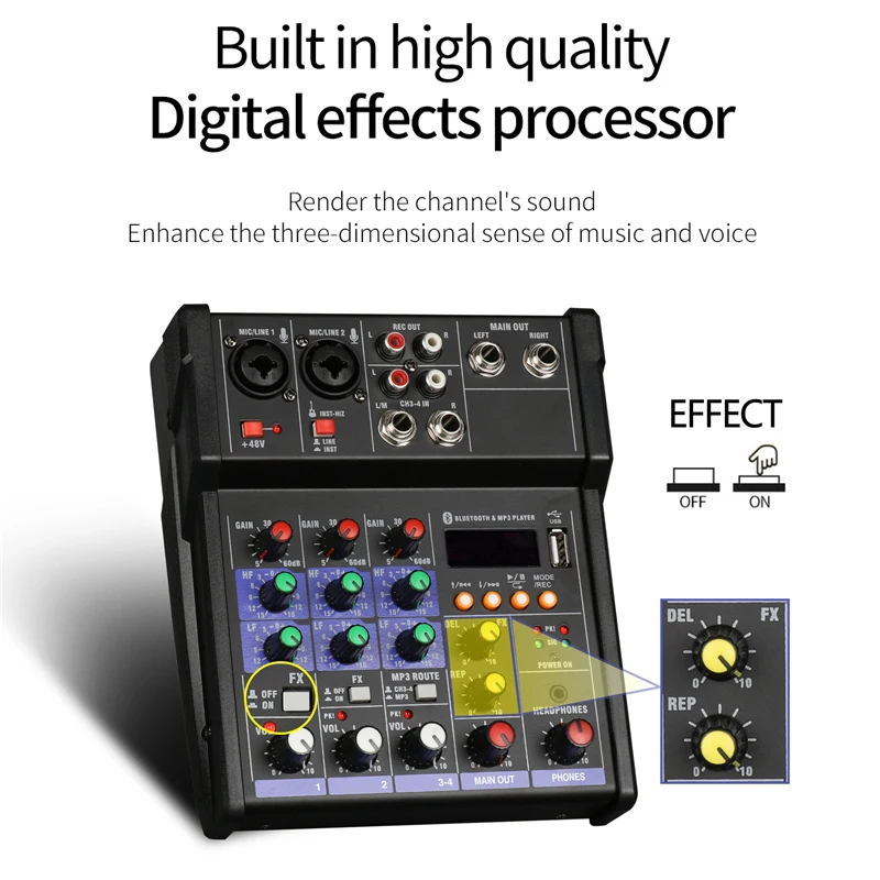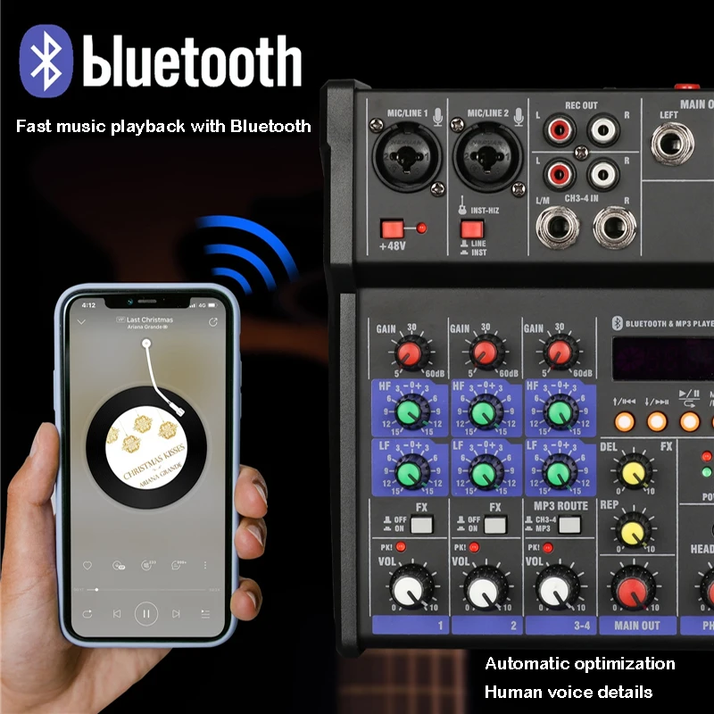 Аудио DJ микшер 4-канальный консоль с беспроводным микрофоном смешивание звука Bluetooth караоке запись студийный стол