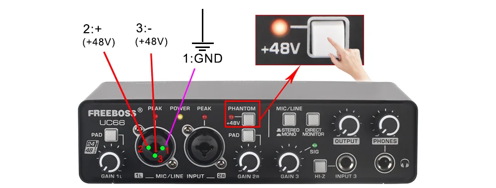 1. 48 В только для разъема XLR, а не для разъема 6,35.