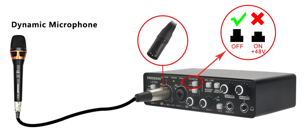 Если Ваш микрофон представляет собой конденсаторный микрофон 48 В, используйте штекер XLR для подключения к звуковой карте и включите фантомное питание 48 В, иначе конденсаторный микрофон 48 В не будет работать на звуковой карте.