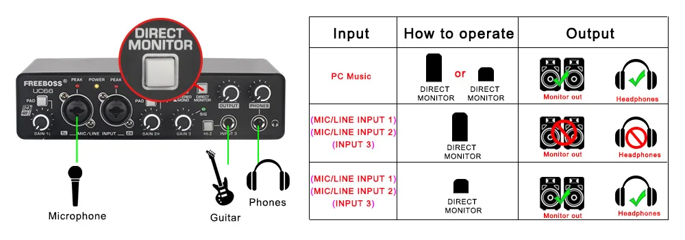 3-канальный вход 24 бит 48 кГц Аудиоинтерфейс Поддержка внешней звуковой карты ASIO4ALL GoldWave со стереофоническим моно-переключателем и кнопкой прямого монитора PAD для системы Windnows Mac OS.